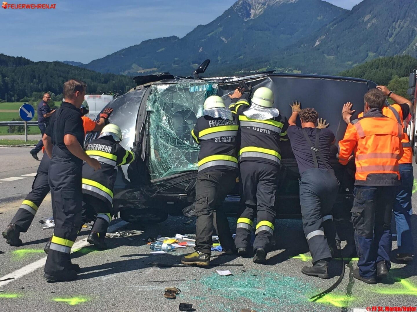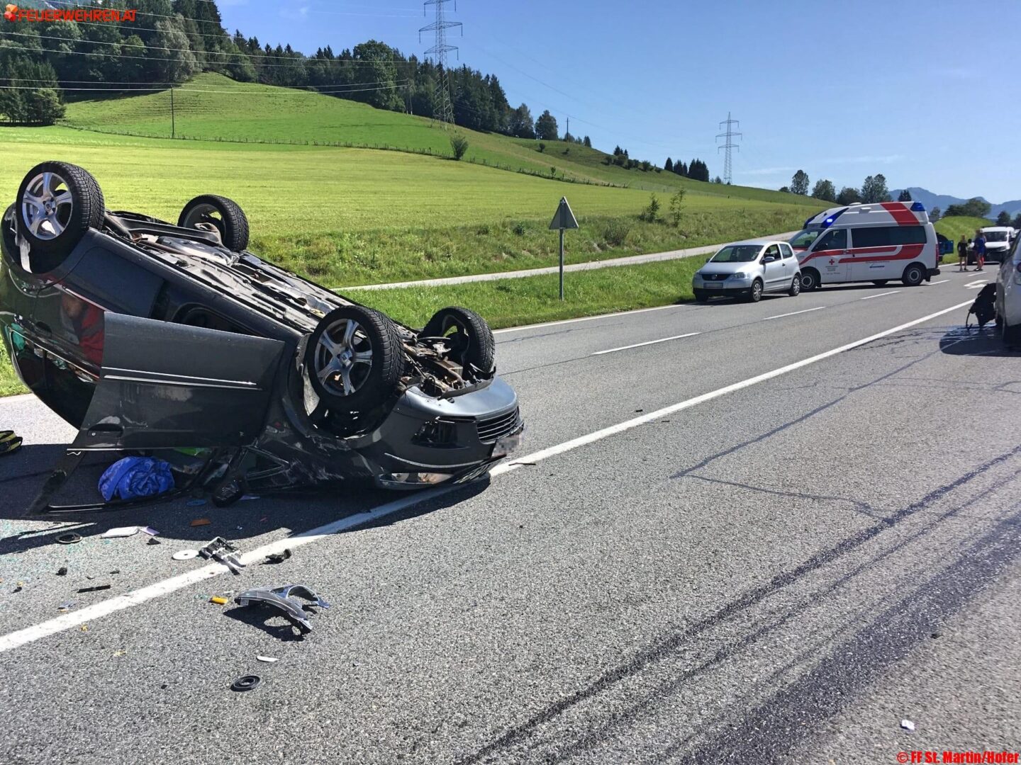 Zwei PKW kollidierten miteinander, ein PKW überschlug sich und blieb auf dem Dach liegen. Betroffen waren eine Lenkerin aus Wien und eine Frau mit zwei Kindern aus dem Bezirk Liezen. Beim Eintreffen der FF St. Martin am Grimming waren die Personen bereits von Ersthelfern aus dem Auto gerettet worden. Die psychische Betreuung der Kinder bis zum Eintreffen des zweiten Rettungsautos übernahmen Sanitäter und eine Feuerwehrsanitäterin gemeinsam.