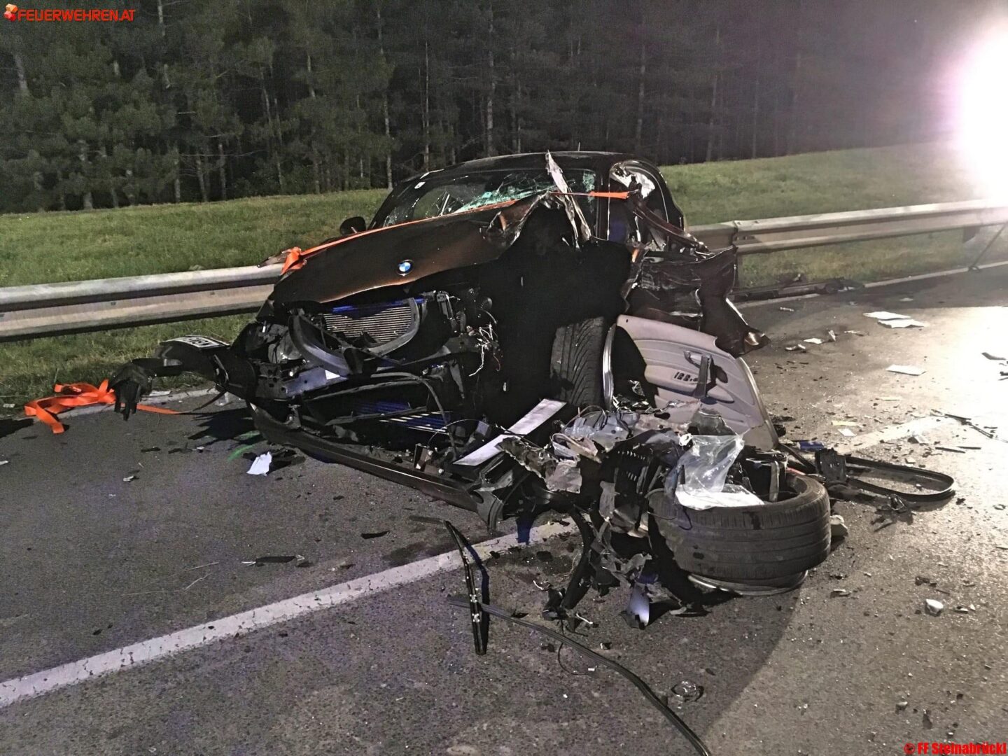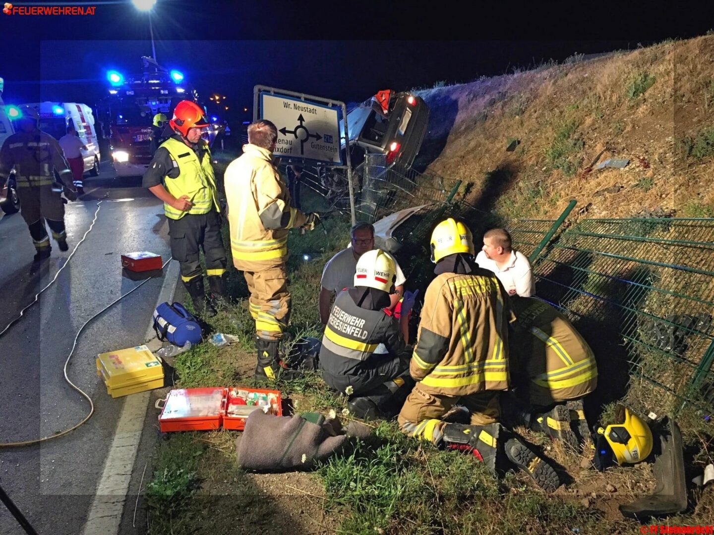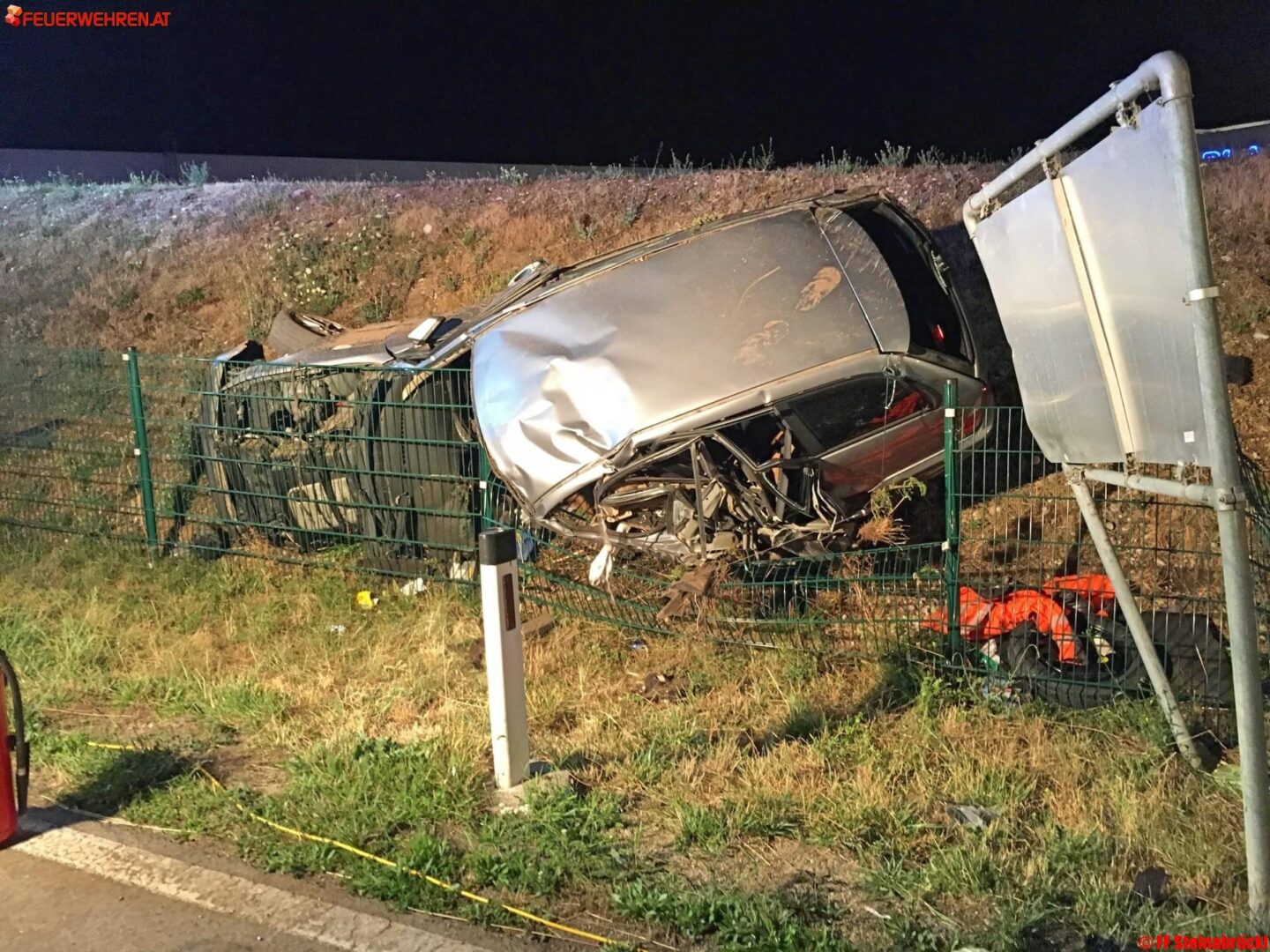 Ein PKW kam auf der Straße zu Stillstand, in dem der PKW-Lenker eingeklemmt wurde. Der Beifahrer konnte sich selbst befreien. Der andere PKW durchstieß nach dem Zusammenstoß einen Begrenzungszaun und kam schlussendlich auf einer Lärmschutzböschung neben der Fahrbahn zum Stillstand. Der Lenker wurde dabei aus dem Fahrzeug geschleudert.