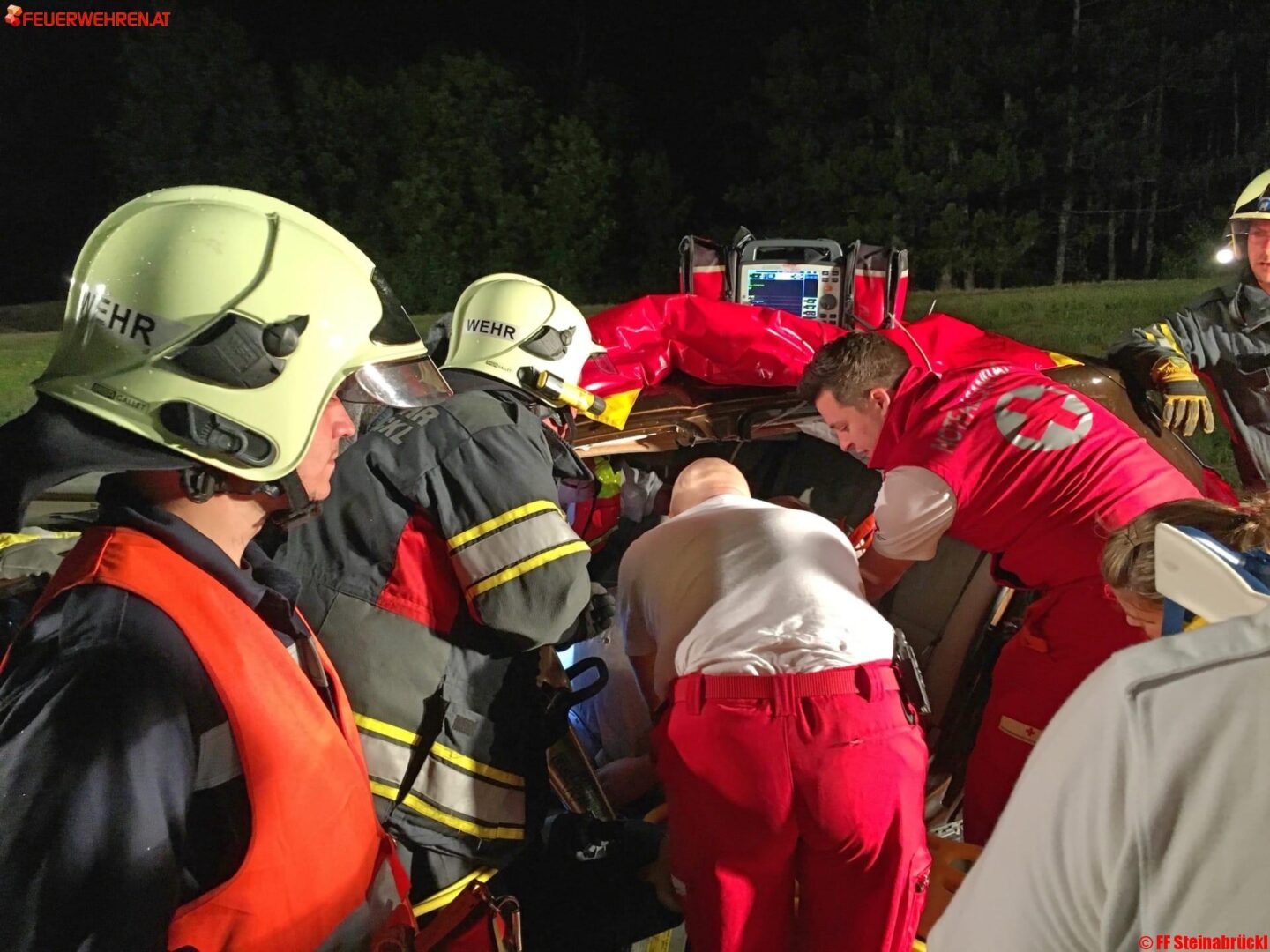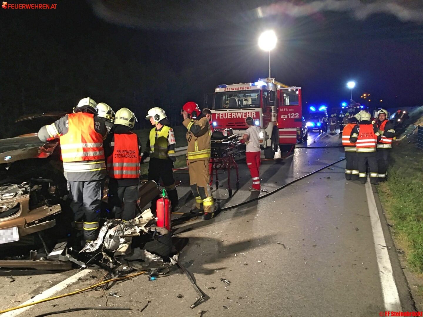 Bei unserem Eintreffen wurde die aus dem Fahrzeug geschleuderte Person durch Rettung und Feuerwehr bereits betreut. Beim anderen PKW wurde, in gemeinschaftlicher Zusammenarbeit der Feuerwehren Steinabrückl und Felixdorf, ein Zugang für den Notarzt geschaffen. Nach der Stabilisierung des Patienten erfolgte mit zwei hydraulischen Rettungsgeräten die technische Rettung aus dem Unfallfahrzeug, die sich auf Grund der Deformierung des Fahrzeuges nicht als sehr einfach herausstellte. Nach rund einer Stunde schweißtreibender Arbeit war jedoch die Person aus dem Fahrzeug befreit werden.