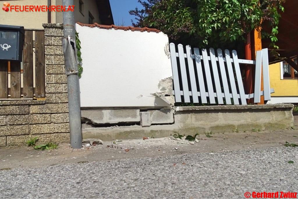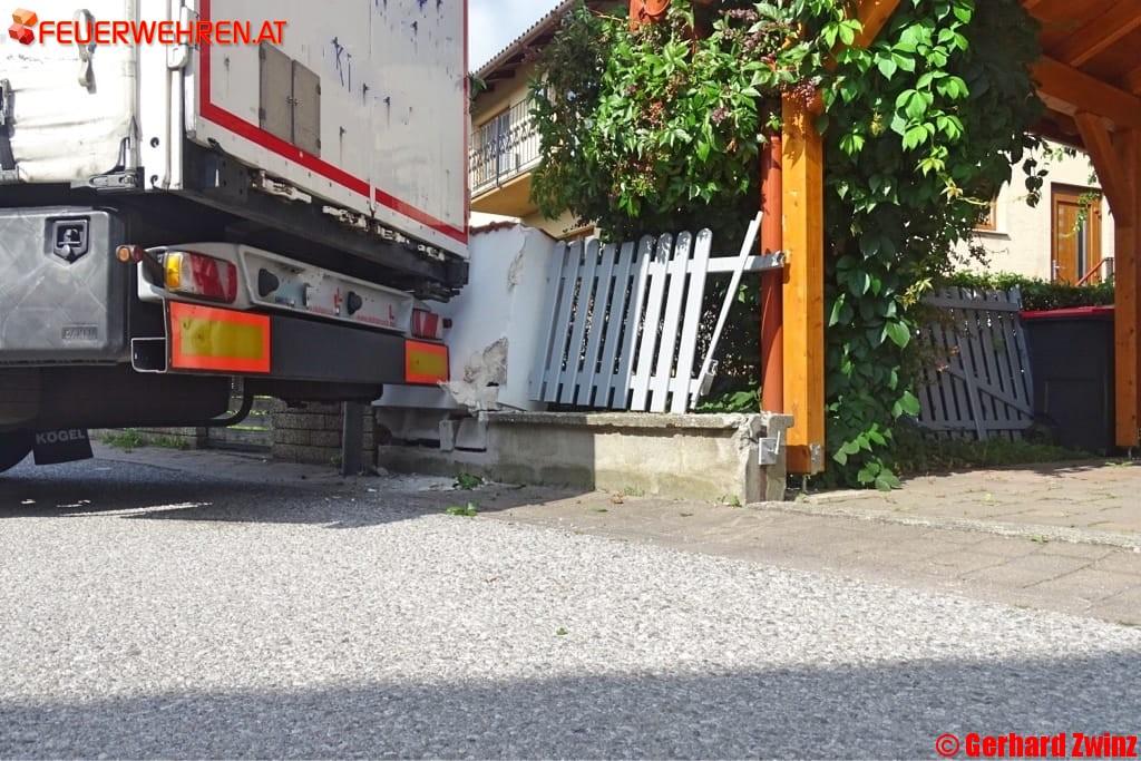 Mit dem Hinterteil des Anhängers streifte er den Carport einer Hauseinfahrt und riss einen Zaun samt Zaunsockel um. Des Weiteren wurden zwei Straßenlaternen beschädigt. Die Feuerwehr Pottschach lotste den LKW wieder zurück auf die Hauptfahrbahn wo er dann seine Fahrt fortsetzen konnte.