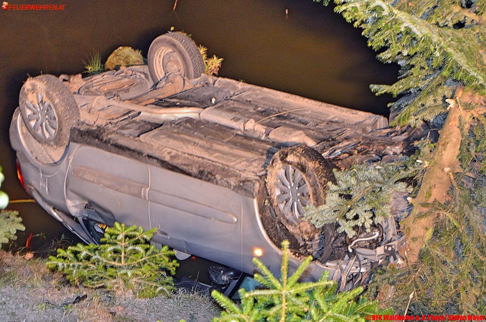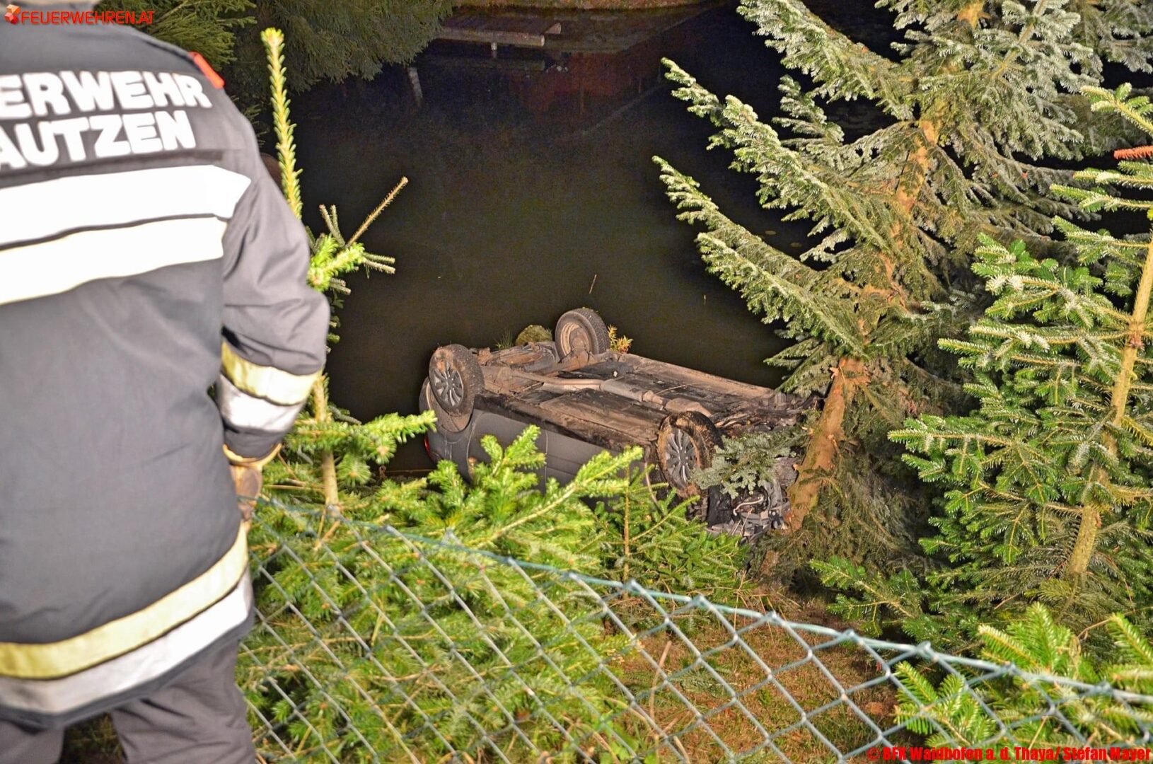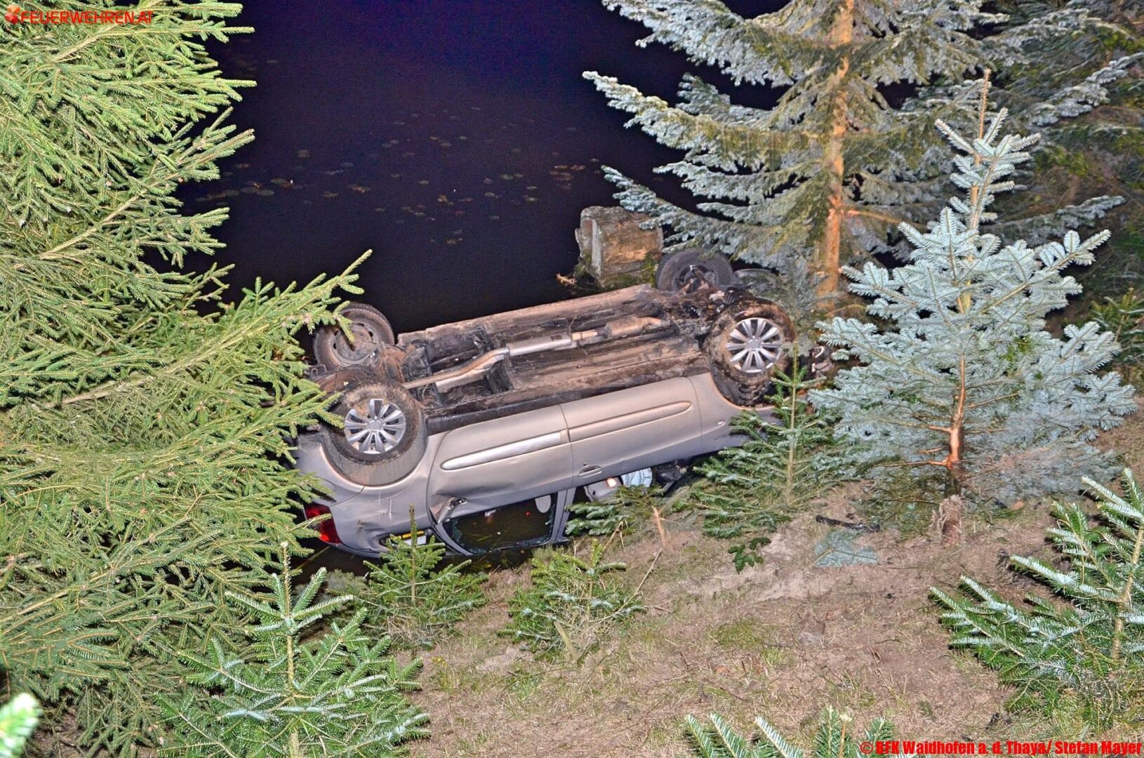Gegen 23 Uhr kam es Freitagnacht zwischen Kleintaxen und Illmau (Gemeinde Kautzen, Bez. Waidhofen an der Thaya, NÖ) zu einem Verkehrsunfall, bei dem ein Fahrzeug in einen Teich stürzte. Die Lenkerin eines PKW kam von der Fahrbahn ab, krachte gegen einen Telefonleitungsmasten und schlitterte über eine 10 Meter hohe Böschung in den Teich. Der PKW kam am Dach zum Liegen, die Frau blieb wie durch ein Wunder unverletzt.