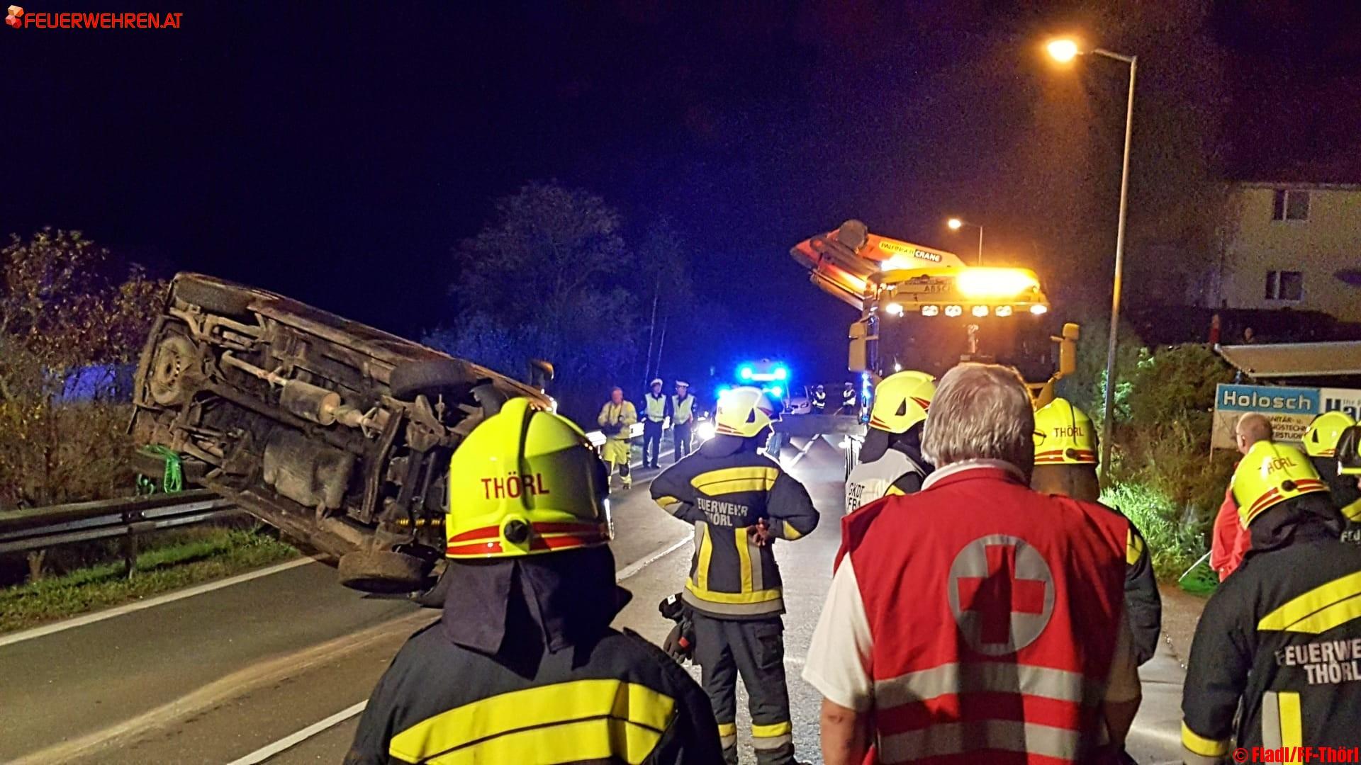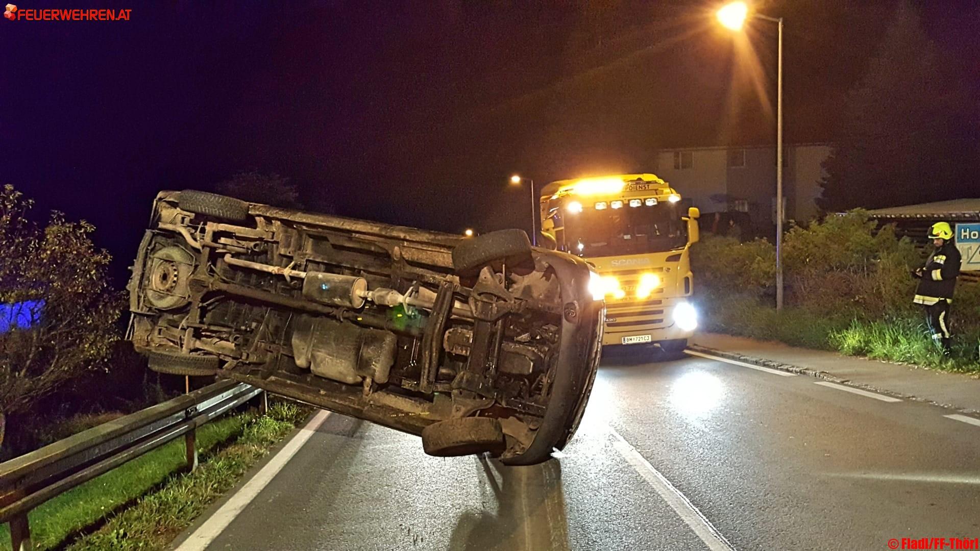 Heute Nacht kurz nach Mitternacht ereignete sich in Thörl ein spektakulärer Verkehrsunfall. Aufgrund unbekannter Ursache kam ein Kleintransporter von der Fahrbahn ab. Nachdem das Fahrzeug eine Leitblanke touchierte überschlug es sich und kam am Dach zum Stillstand.