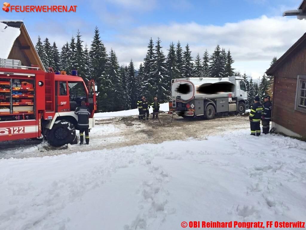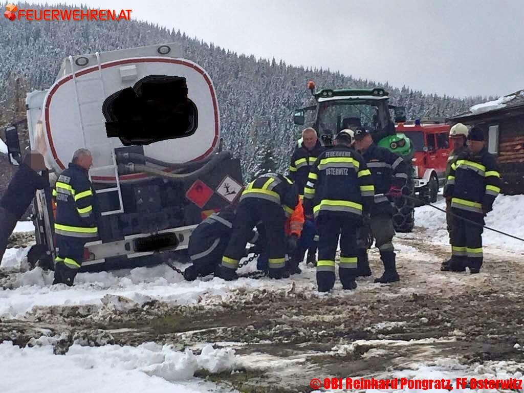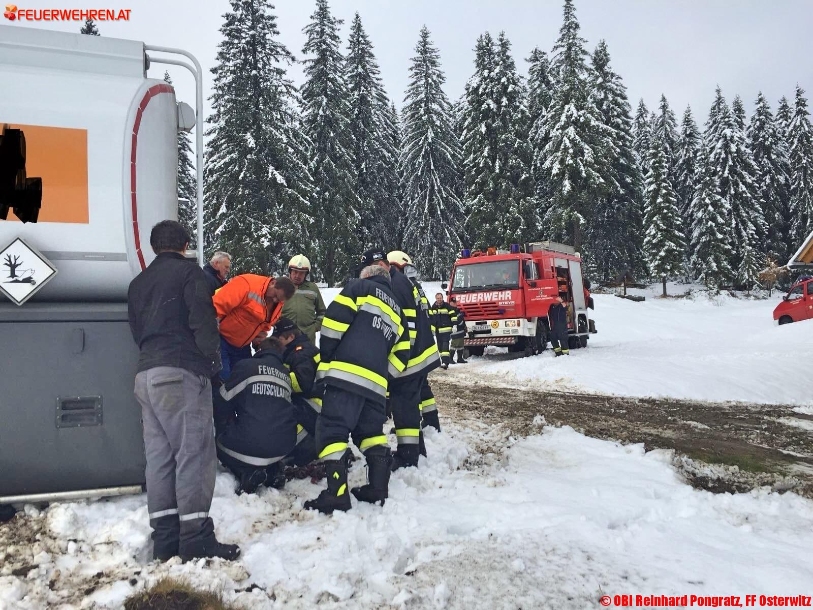 Am Donnerstag, den 09. November 2017, wurde gegen 09:30 Uhr die Feuerwehr Osterwitz zu einer Tankwagenbergung auf der Stoffhütte in Osterwitz alarmiert. Am Einsatzort angekommen erkundete der Einsatzleiter OBI Reinhard Pongratz von der FF Osterwitz die Lage.