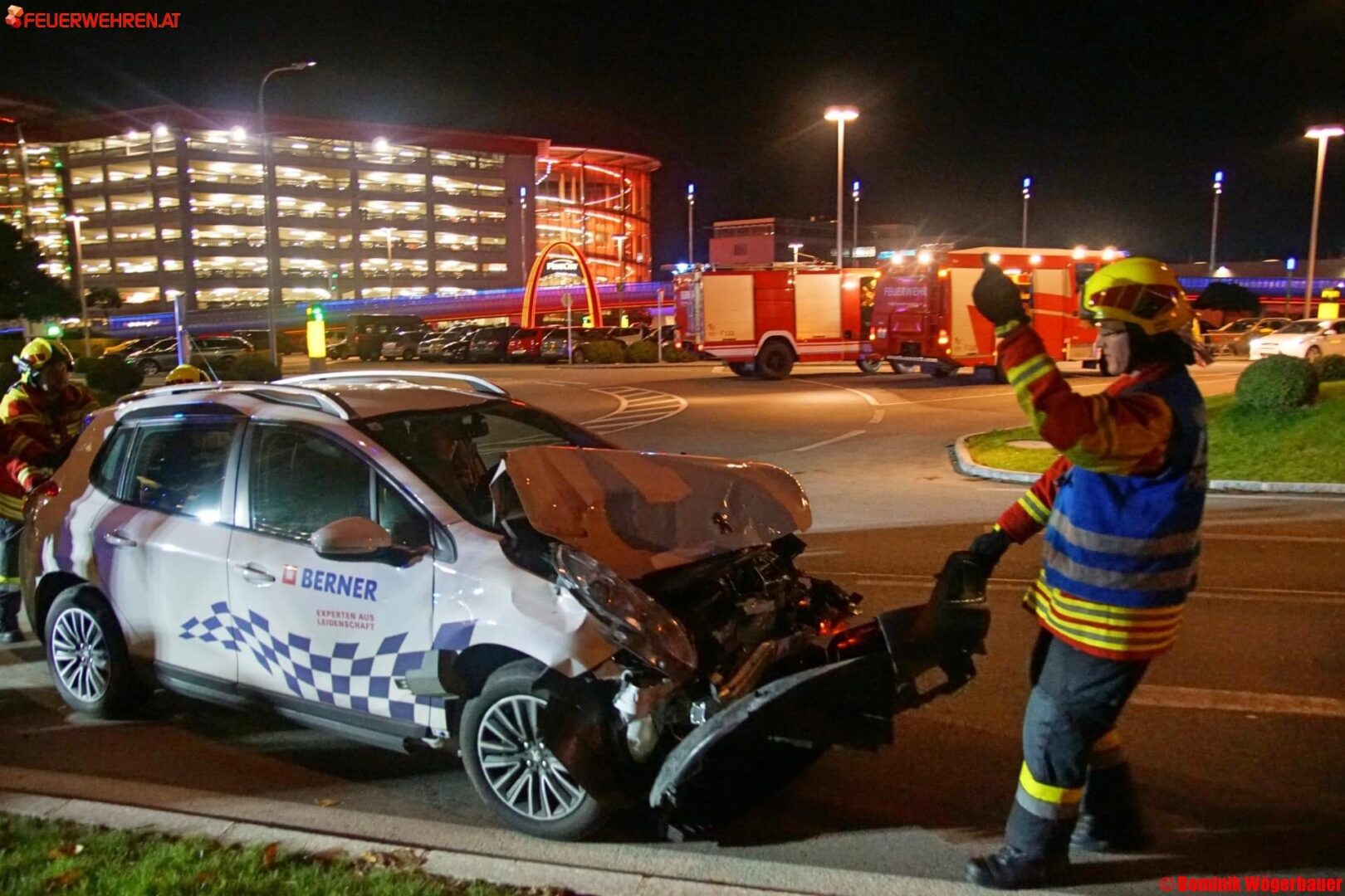Zu einem spektakulären Verkehrsunfall kam es Donnerstagabend, den 02. November kurz vor 20.00 Uhr bei der Ausfahrt eines Einkaufszentrum in Pasching. Nach einem Zusammenstoß von zwei PKWs verkeilte sich eines der beiden Fahrzeuge zwischen einer Straßenlaterne und dem zweiten beteiligten Unfallfahrzeug.