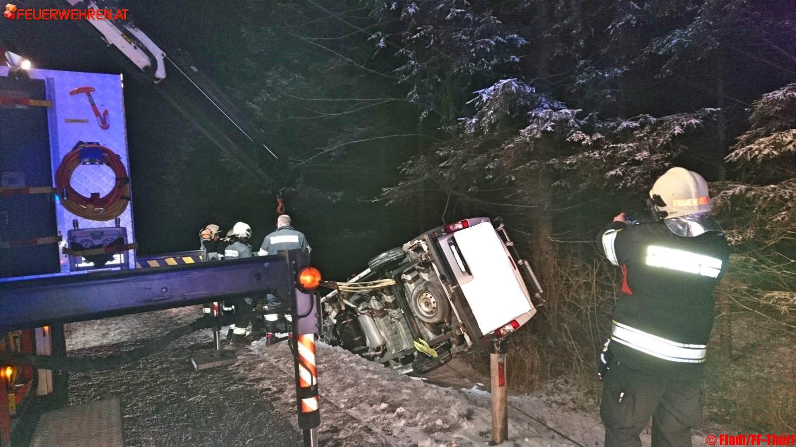 Nach Erkundung der Unfallstelle durch den Einsatzleiter stellte sich heraus, dass sich bereits beide Insassen aus eigener Kraft aus dem Fahrzeug befreien konnten. Währenddessen kümmerten sich die Kameraden um die Absicherung der Unfallstelle. Das Fahrzeug kam bei diesem Unfall aufgrund unbekannter Ursache von der Fahrbahn ab und kam seitlich liegend im Straßengraben zum Stillstand. Daher wurde dieses mittels Seilwinde gesichert und mit einem Kranfahrzeug der Feuerwehr Kapfenberg wieder auf die Fahrbahn gehoben. Anschließend konnte der Kastenwagen von einem privaten Abschleppunternehmen abtransportiert werden.