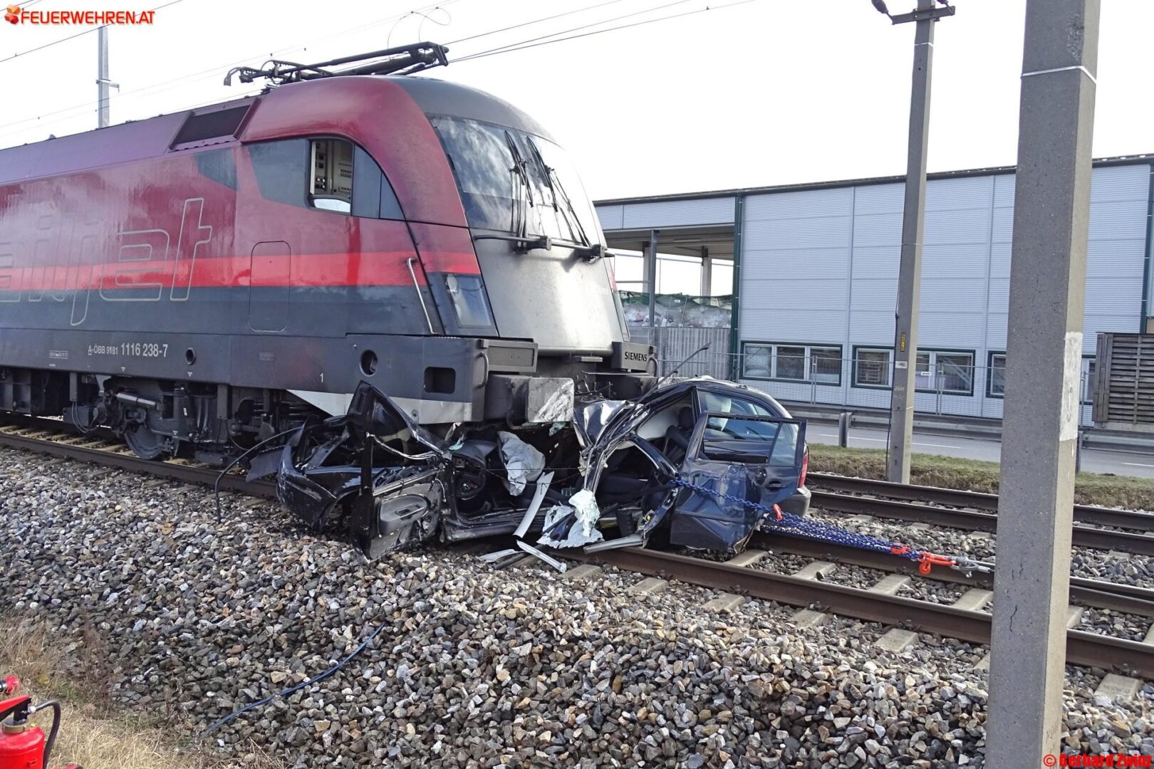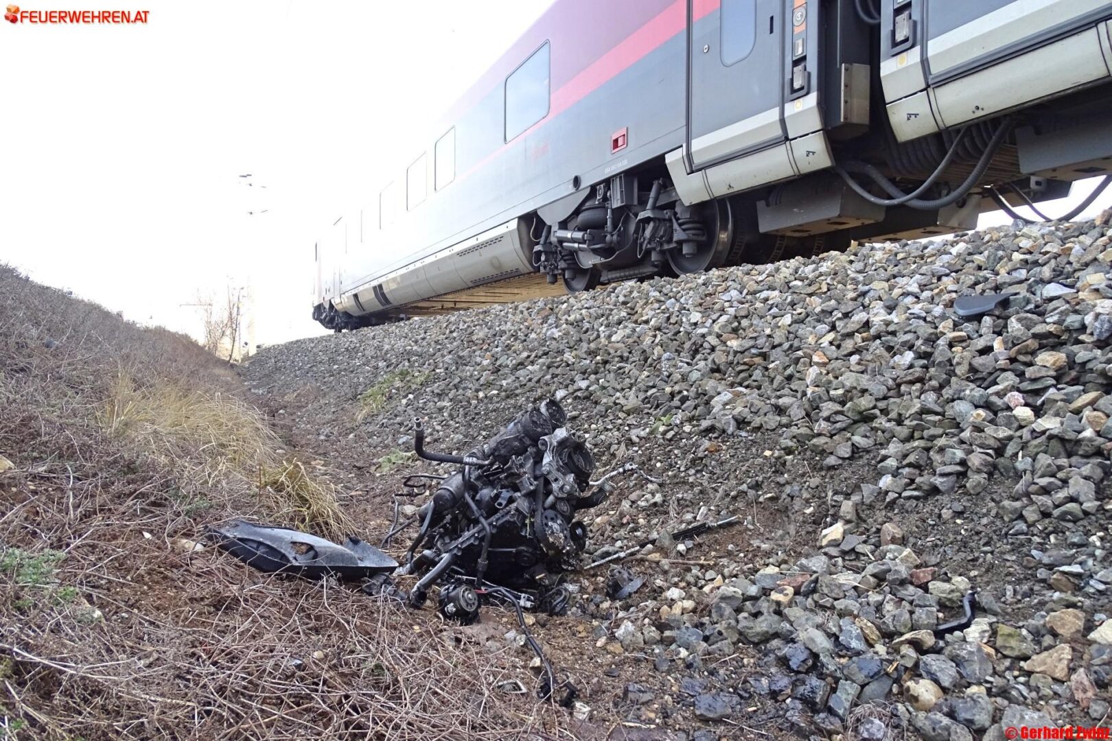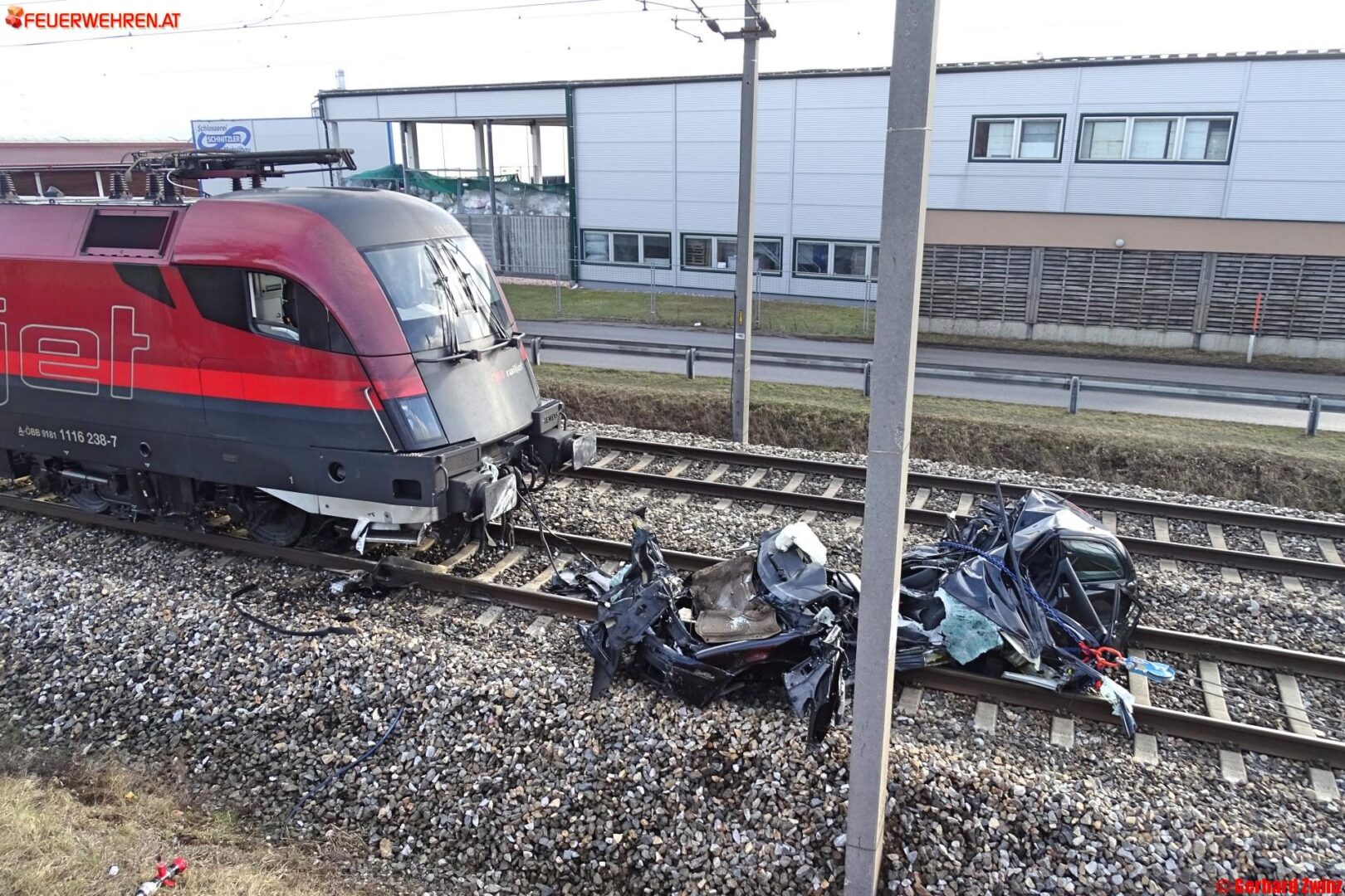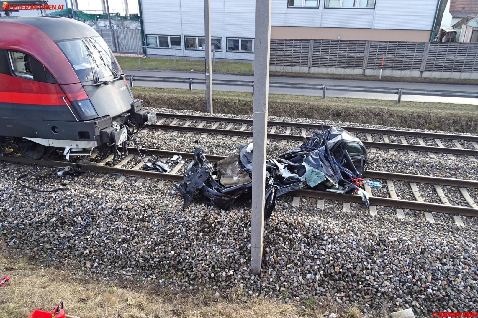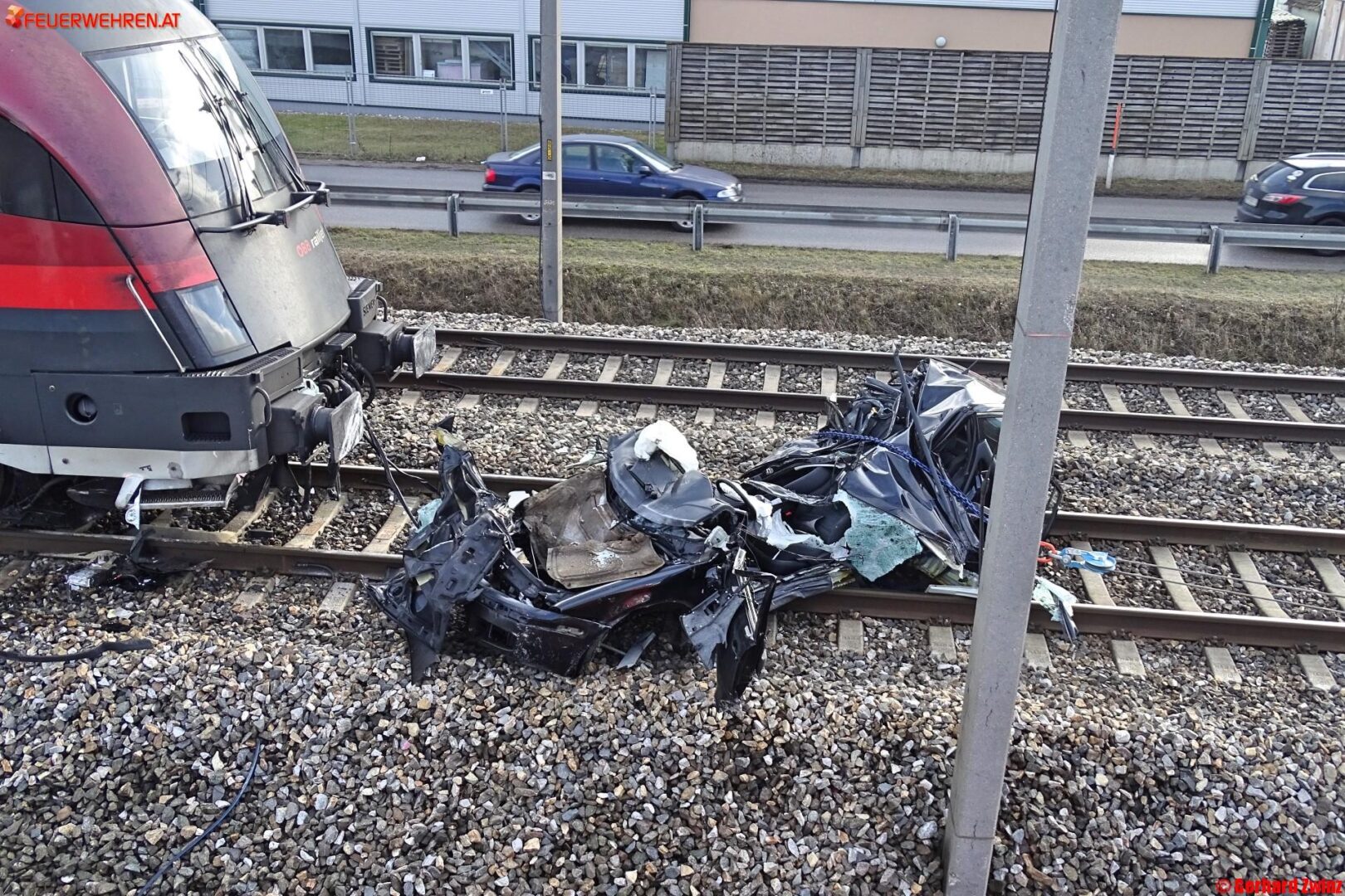 Das Auto rutschte am Bahnübergang Rohrbacherstraße in Ternitz (Bezirk Neunkirchen) aus noch unbekannter Ursache von der Fahrbahn und kam auf den Gleisen der Südbahn zum Stillstand. Der Lenker konnte sich aber aus dem Fahrzeug befreien und verständigte den Notruf. Wenige Augenblicke später wurde der Pkw von einem Railjet erfasst.