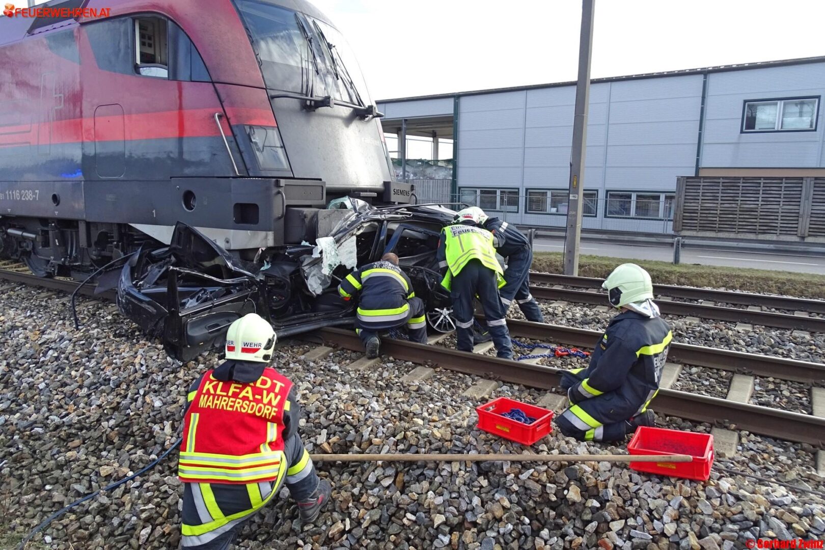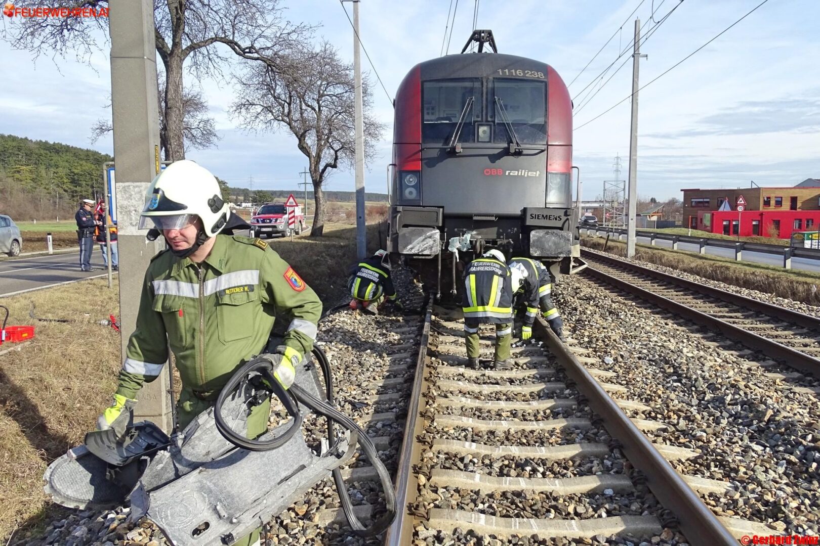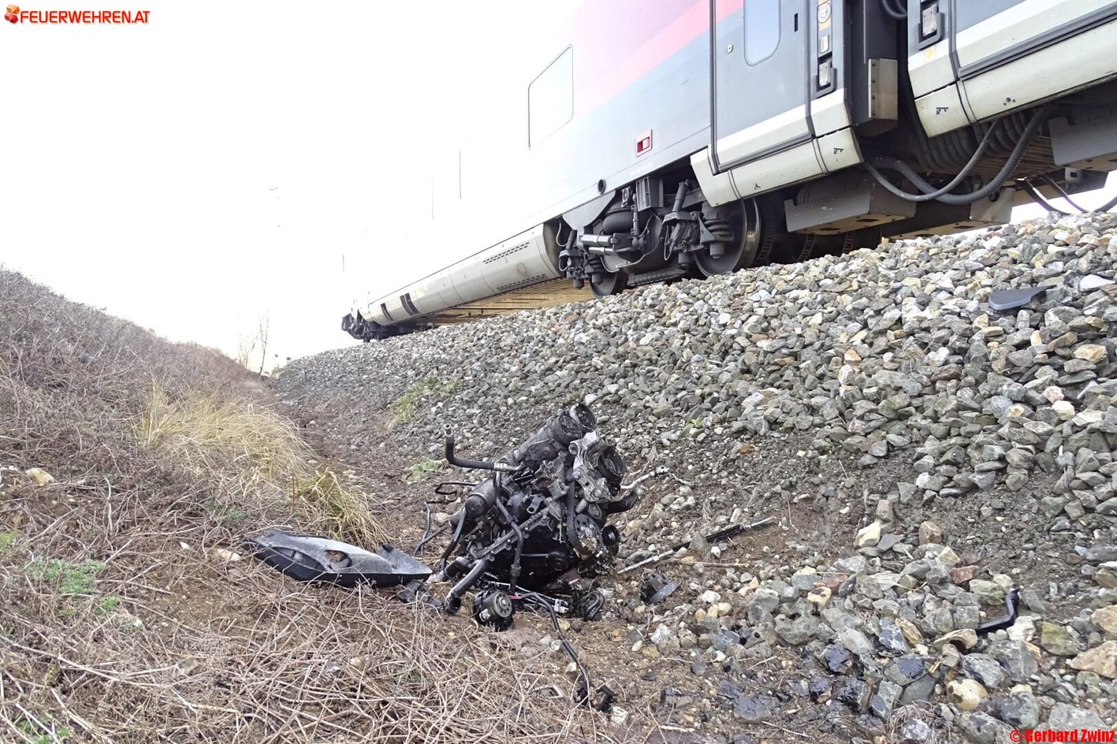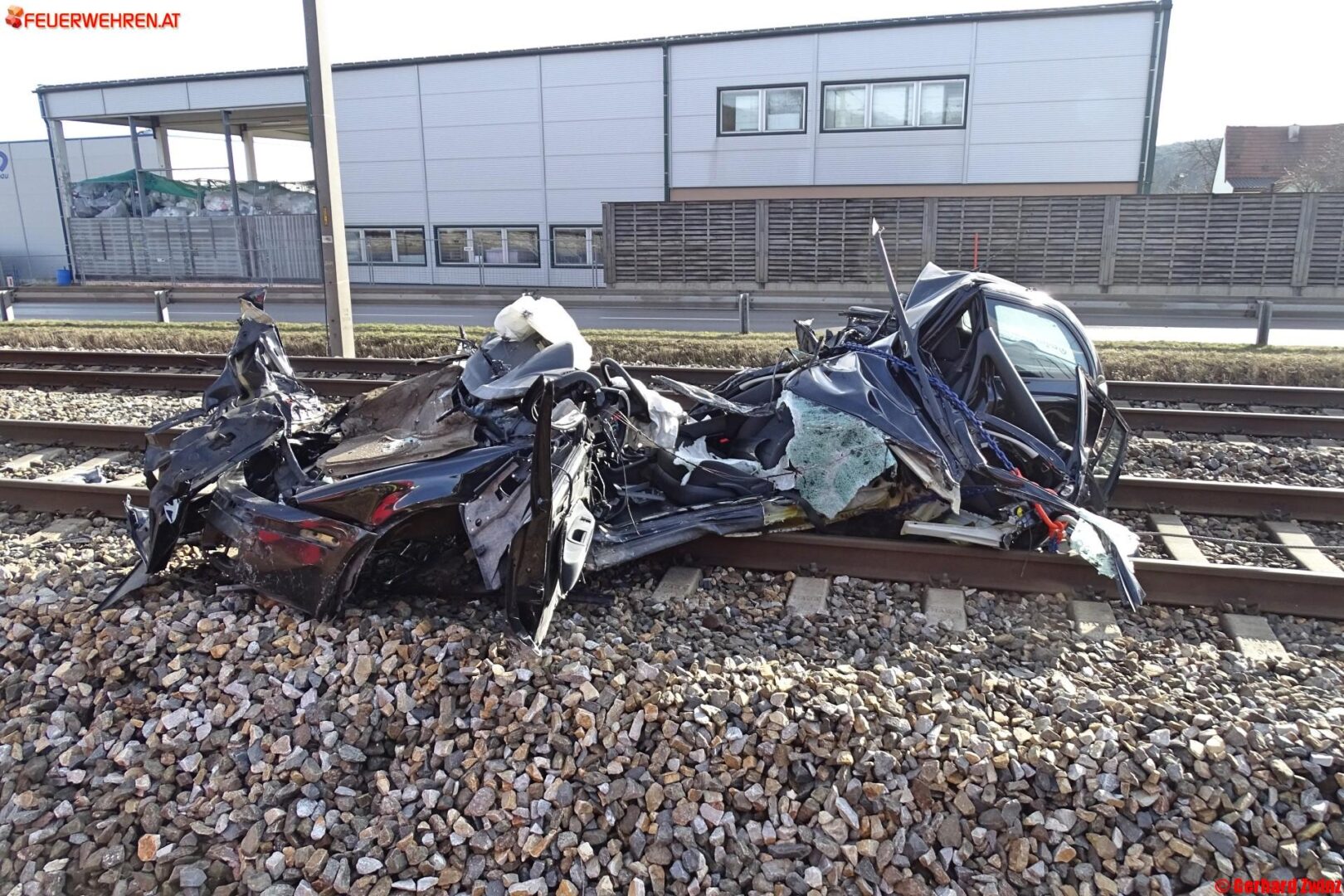 Das Auto rutschte am Bahnübergang Rohrbacherstraße in Ternitz (Bezirk Neunkirchen) aus noch unbekannter Ursache von der Fahrbahn und kam auf den Gleisen der Südbahn zum Stillstand. Der Lenker konnte sich aber aus dem Fahrzeug befreien und verständigte den Notruf. Wenige Augenblicke später wurde der Pkw von einem Railjet erfasst.