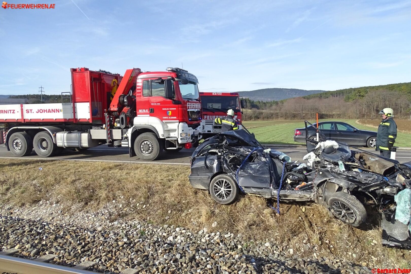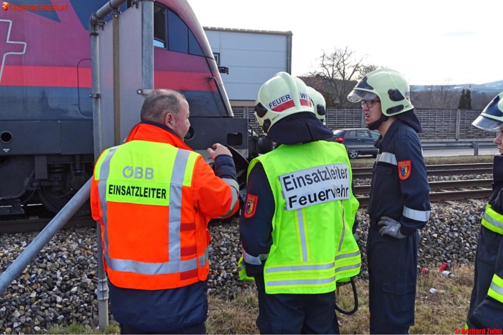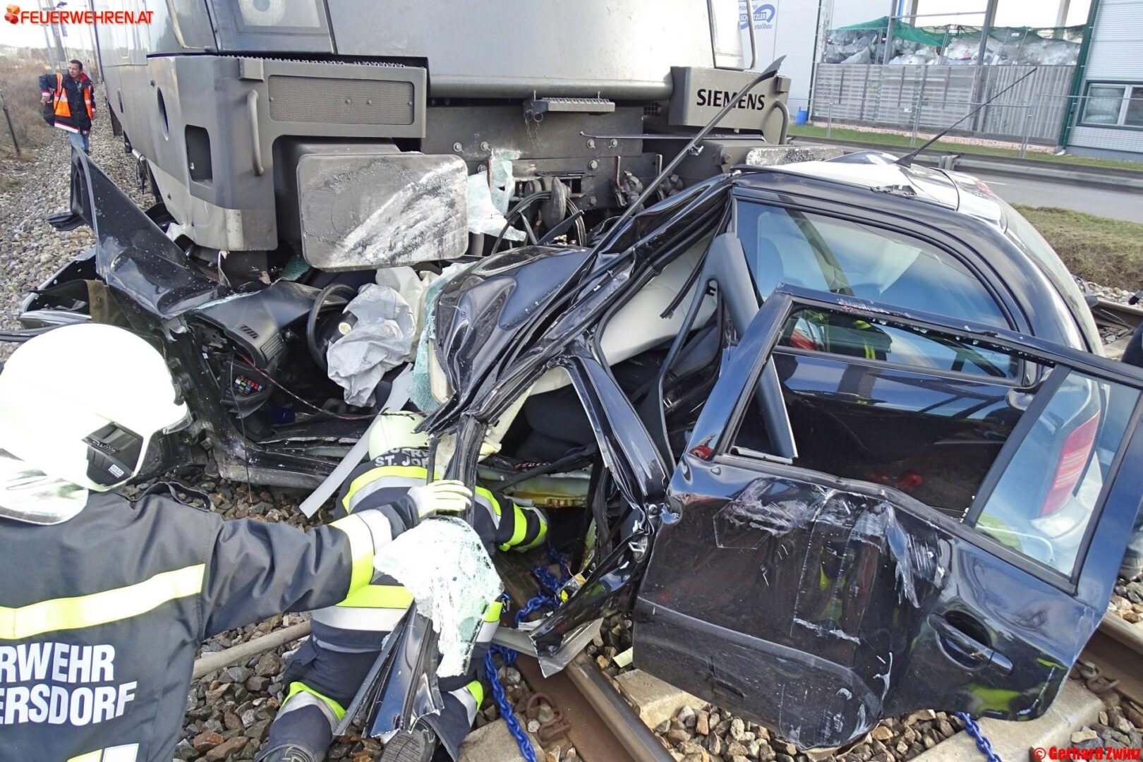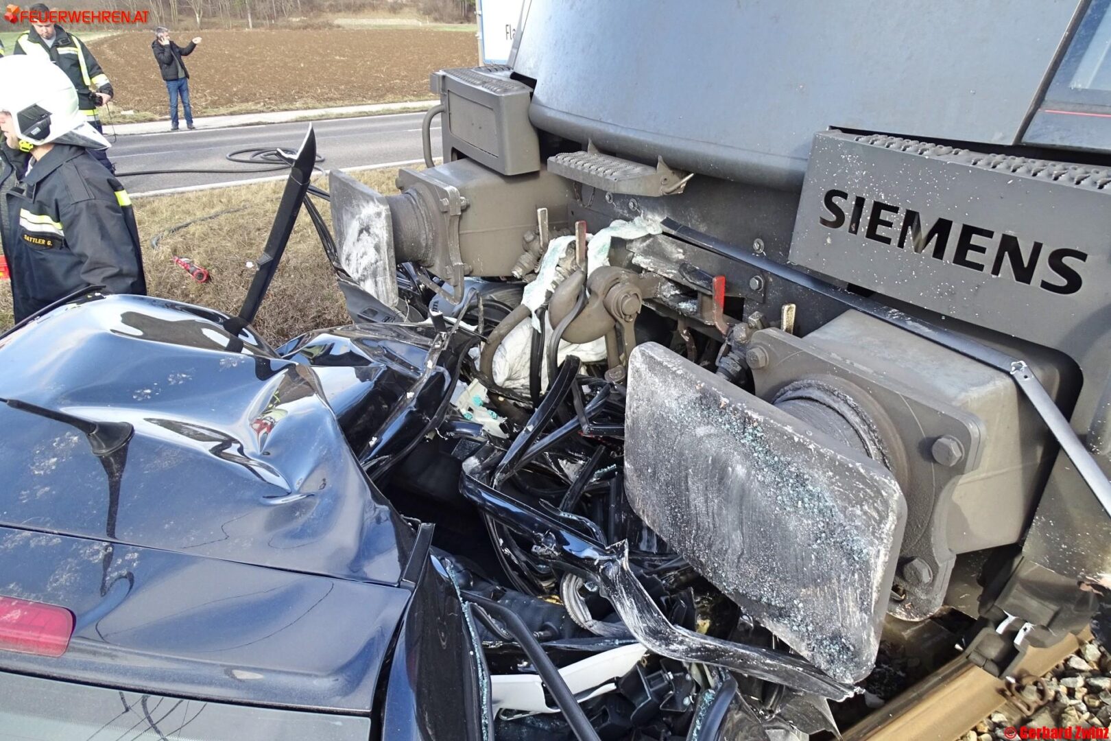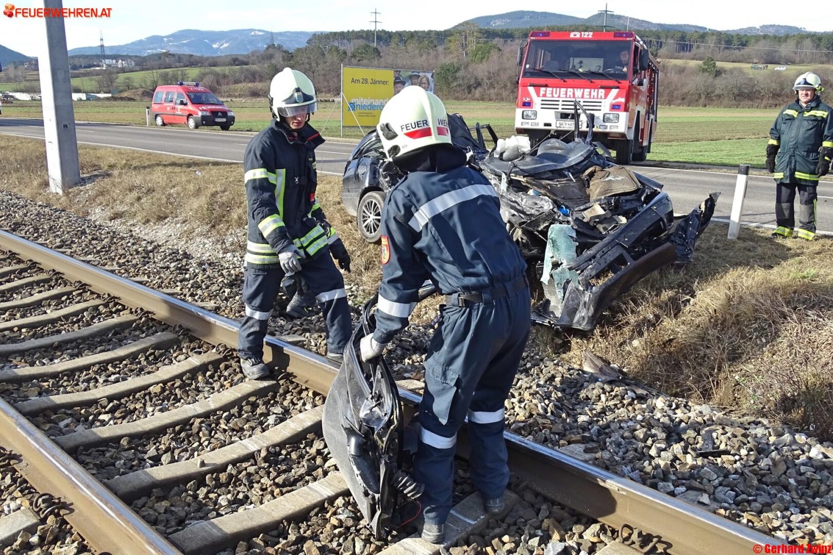 Das Auto rutschte am Bahnübergang Rohrbacherstraße in Ternitz (Bezirk Neunkirchen) aus noch unbekannter Ursache von der Fahrbahn und kam auf den Gleisen der Südbahn zum Stillstand. Der Lenker konnte sich aber aus dem Fahrzeug befreien und verständigte den Notruf. Wenige Augenblicke später wurde der Pkw von einem Railjet erfasst.