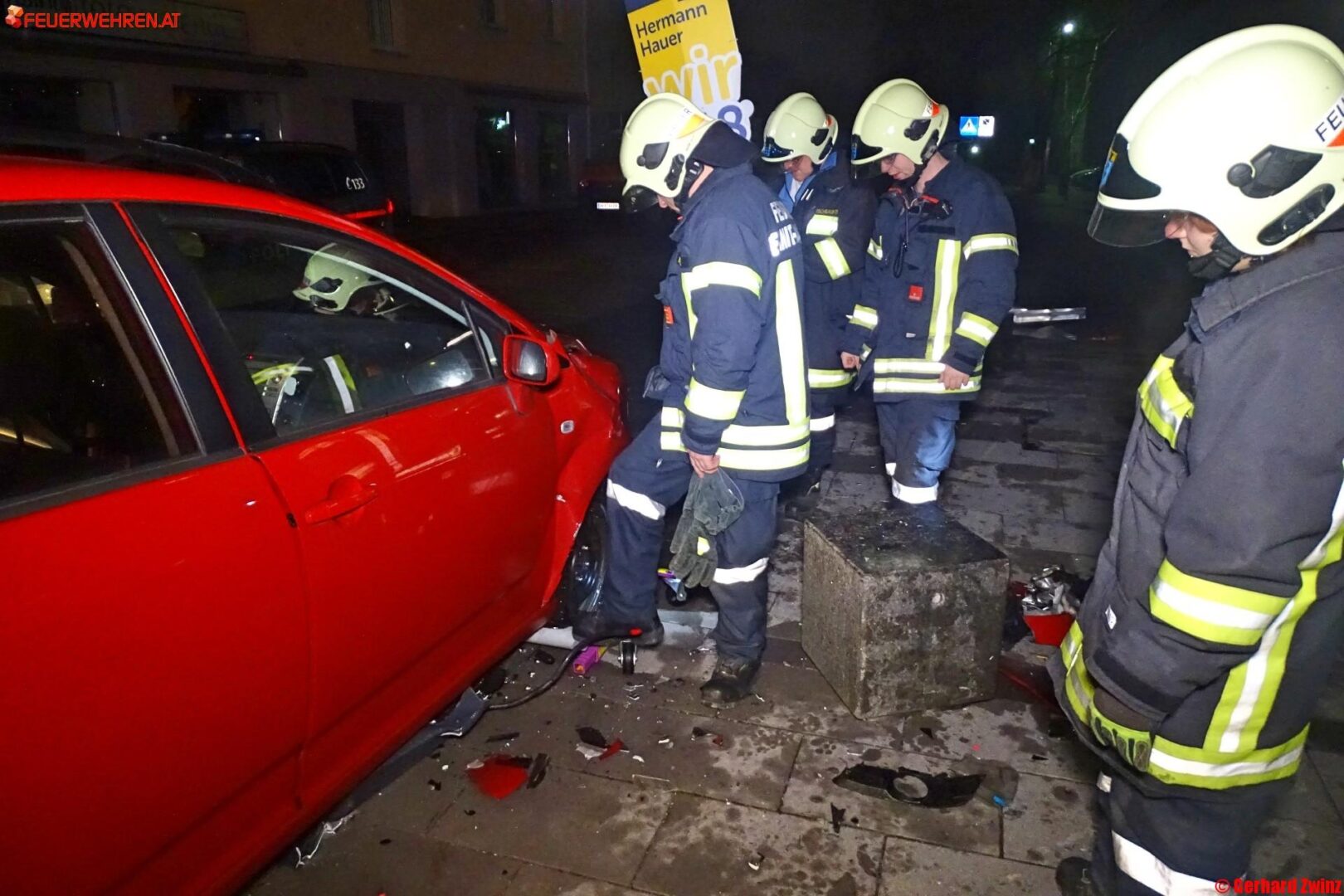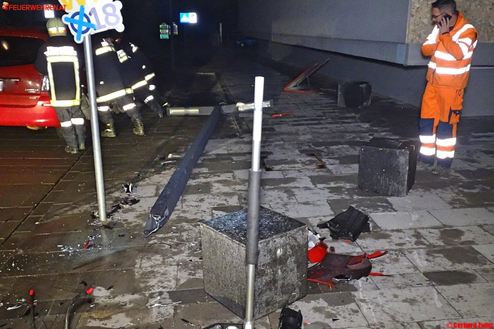 Aus noch unbekannter Ursache ist ein Autolenker beim Ternitzer Stadtplatz von der Straße abgekommen, kollidierte mit mehreren Begrenzungssteinen und einer Wahlwerbetafel, welche auf den Gehsteig verschoben wurden. Anschließend krachte der Pkw gegen eine Straßenlaterne die durch den Aufprall direkt am Boden abgerissen wurde. Zur Unfallzeit befanden sich glücklicherweise keine Personen auf dem Gehsteig.