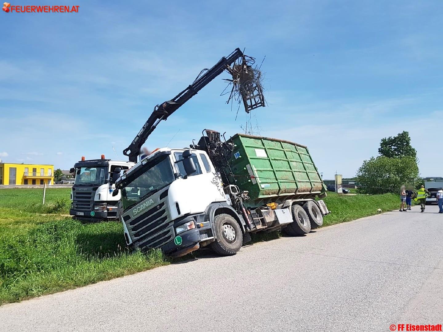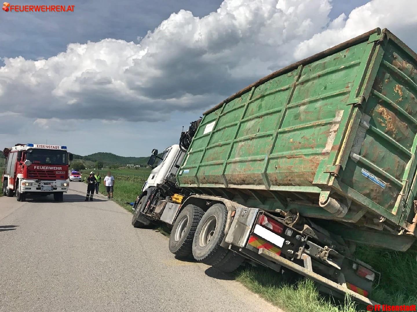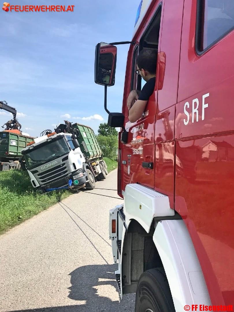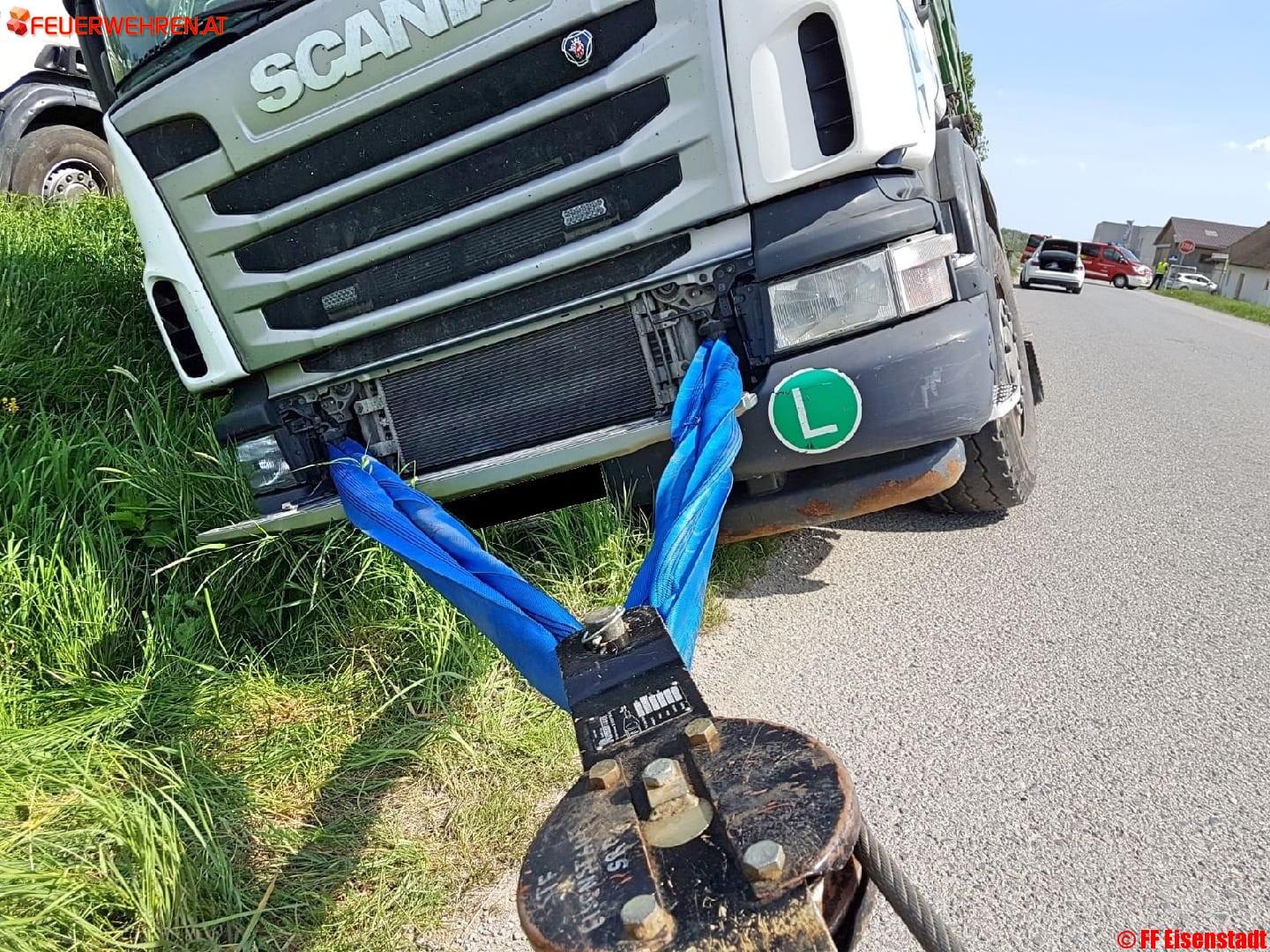 Beim Eintreffen an der Einsatzstelle war der LKW, der bei der Zufahrt zu einem Firmengelände in den Graben gerutscht war, bereits durch die Kameraden aus Purbach gegen Umstürzen und weiteres Abrutschen gesichert. Außerdem wurde das Ladegut in einen weiteren LKW umgeladen um das Gewicht zu reduzieren. Gemeinsam wurde der LKW unter Zuhilfenahme von mehreren Seilwinden und dem Einscheren einer losen Rolle vorsichtig geborgen.
