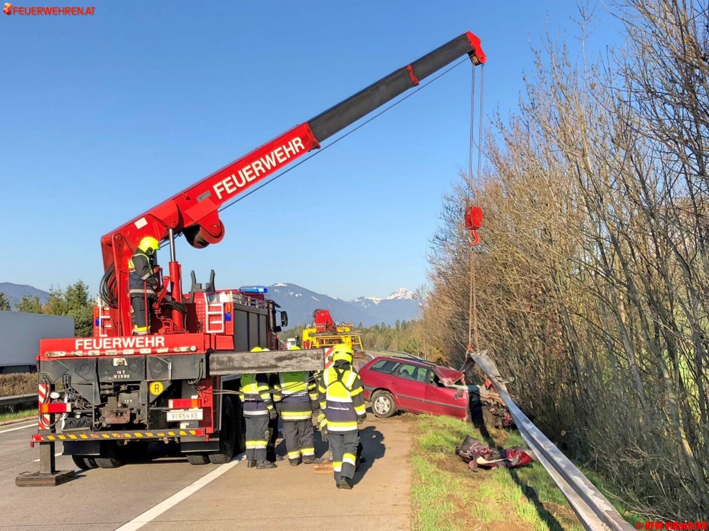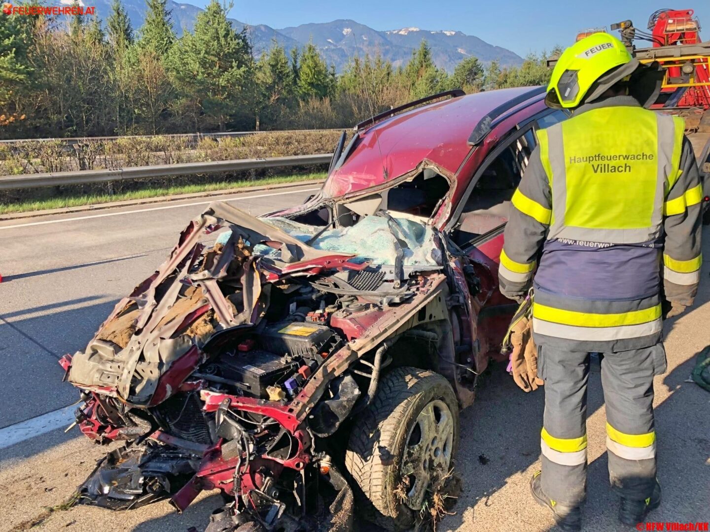 „Beim Eintreffen konnte festgestellt werden, dass ein PKW aus unbekannter Ursache von der Fahrbahn abgekommen ist und sich unter der Leitschiene verkeilt hatte“, berichtet Einsatzleiter BM Christoph Kelz, Zugskommandant der Hauptfeuerwache Villach.