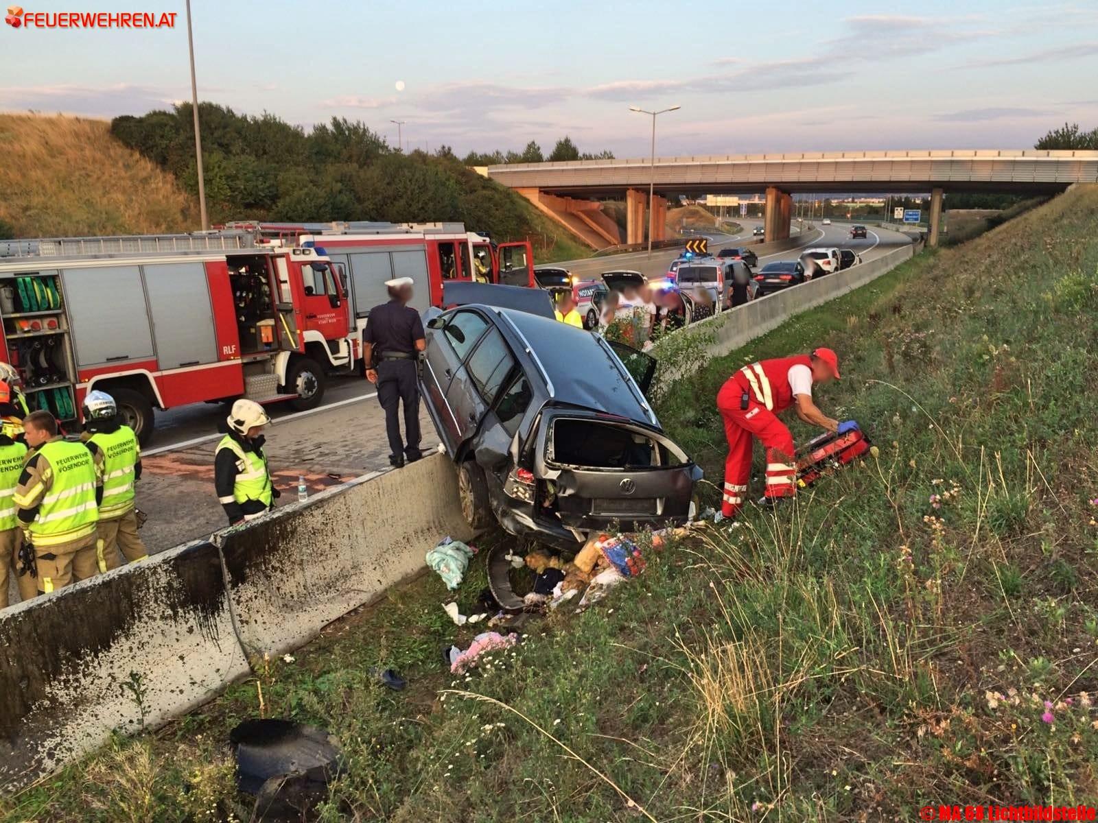 Die Einsatzkräfte der Berufsfeuerwehr Wien unterstützten Verwandte der verunfallten Familie, die in anderen Fahrzeugen unterwegs waren und das Rote Kreuz bei der Rettung der Verletzten aus dem vollkommen zerstörten Fahrzeug. Gleichzeitig wurde ein Brandschutz mit einer Löschleitung und einem Pulverlöscher aufgebaut, die aus dem Fahrzeug hängende Batterie entfernt und ausgeflossenes Motoröl gebunden.