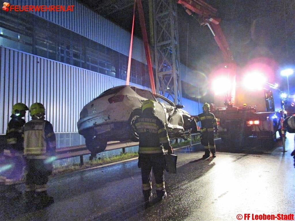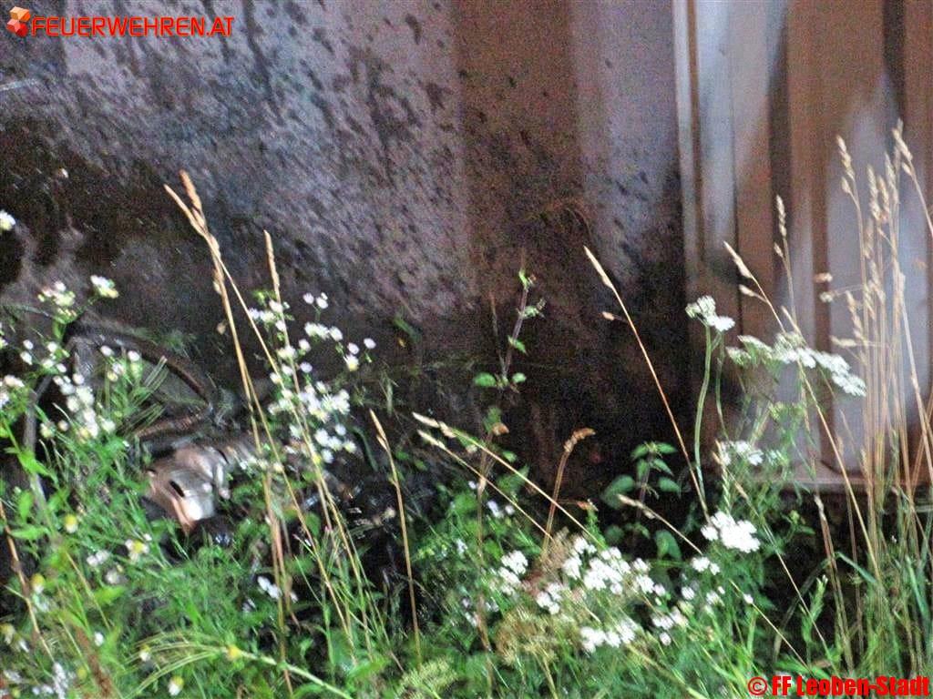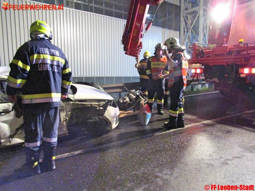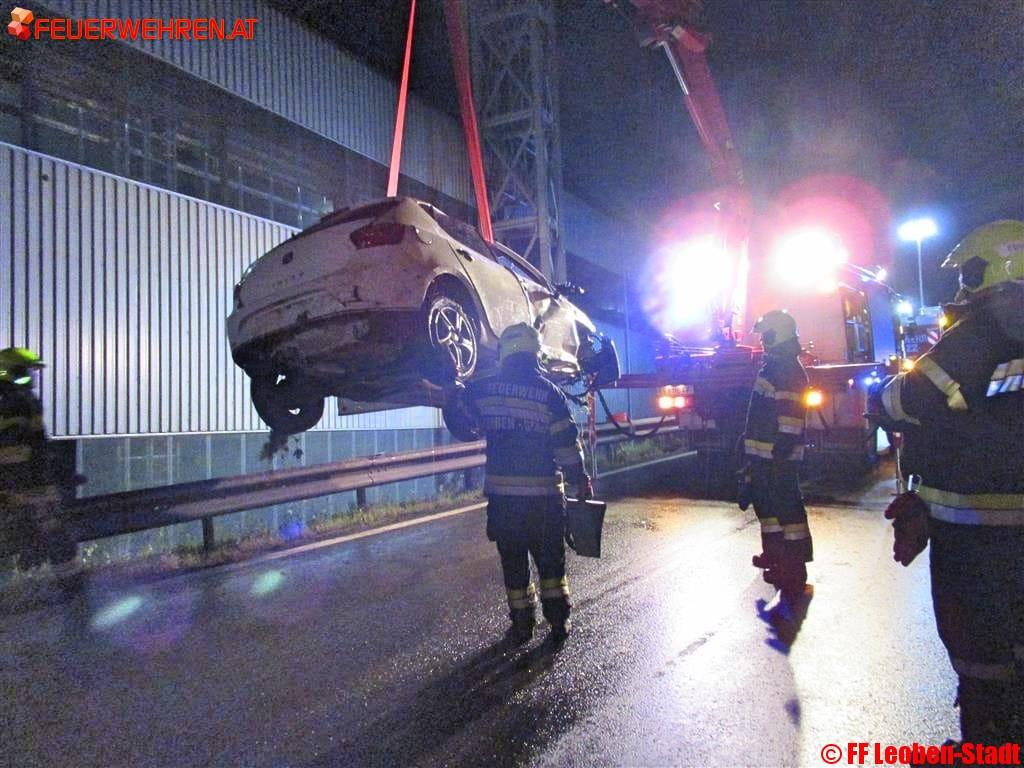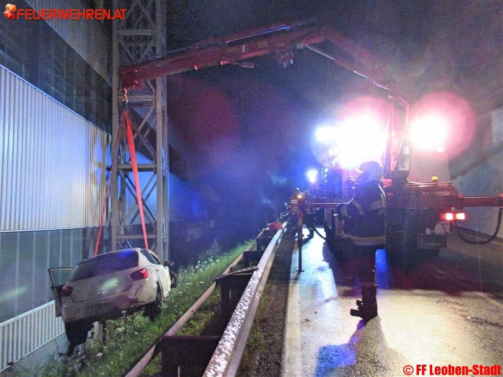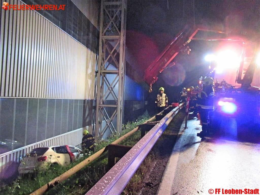 Am 22.07.2018 um 21:48 Uhr alarmierte die Landesleitzentrale Florian Steiermark die Freiwillige Feuerwehr Leoben-Stadt und die Freiwillige Feuerwehr Leoben-Göß mit dem Alarmstichwort „T10-VU-eingekl.“ zu einem Verkehrsunfall mit eingeklemmter Person auf der B115a Höhe ehemalige Kühltürme. Aus unbekannter Ursache kam ein Fahrzeug von der Straße ab, beschädigte eine Halle der VOESTALPINE und kam in der Folge im Straßengraben zu stehen.