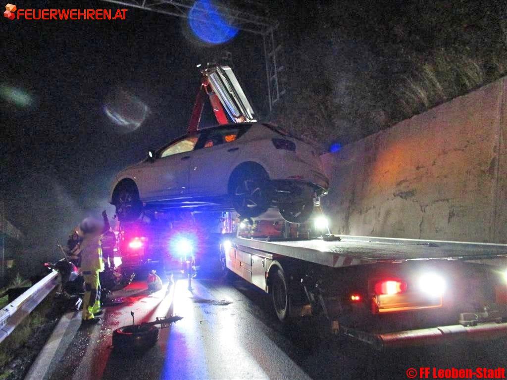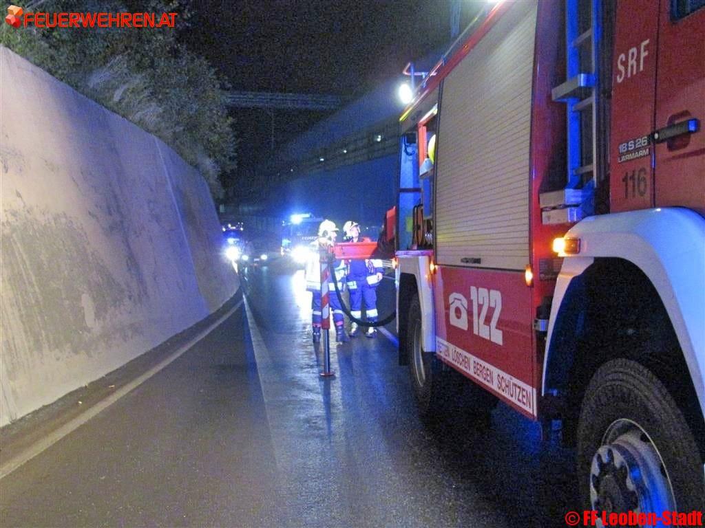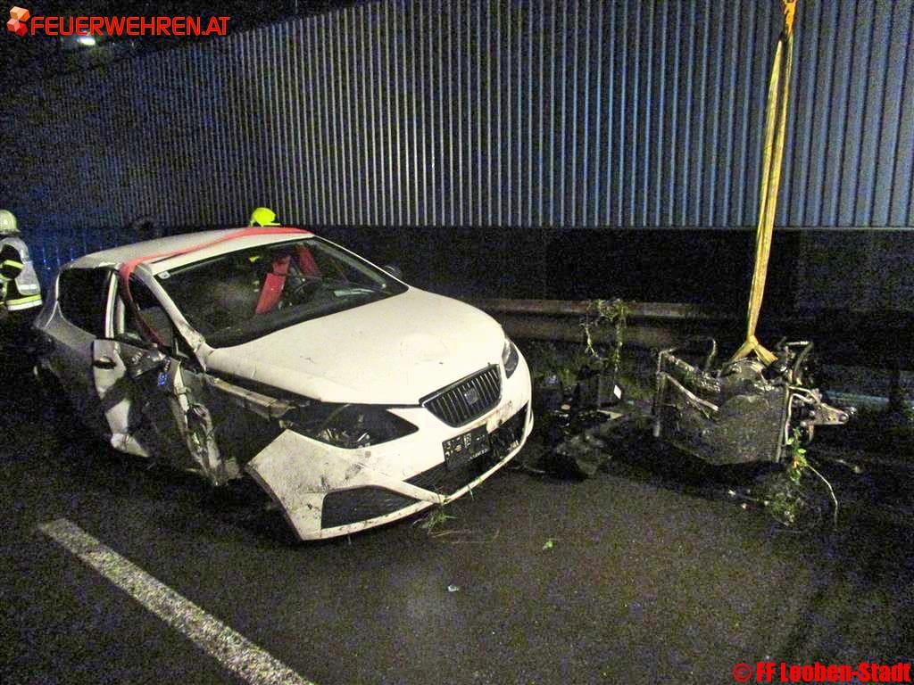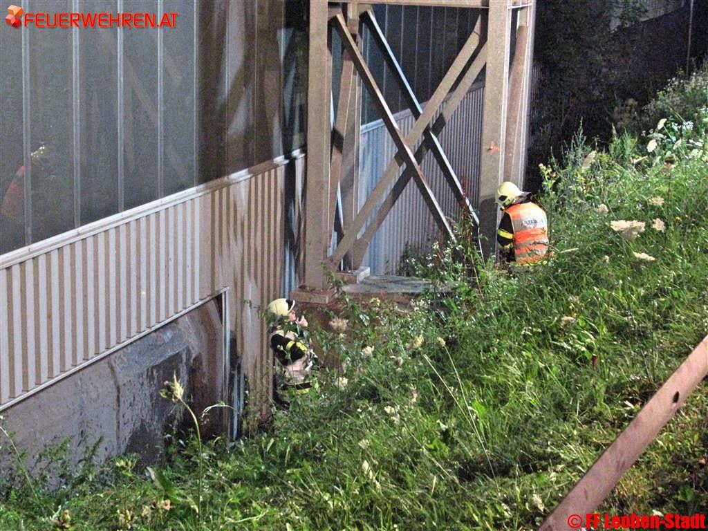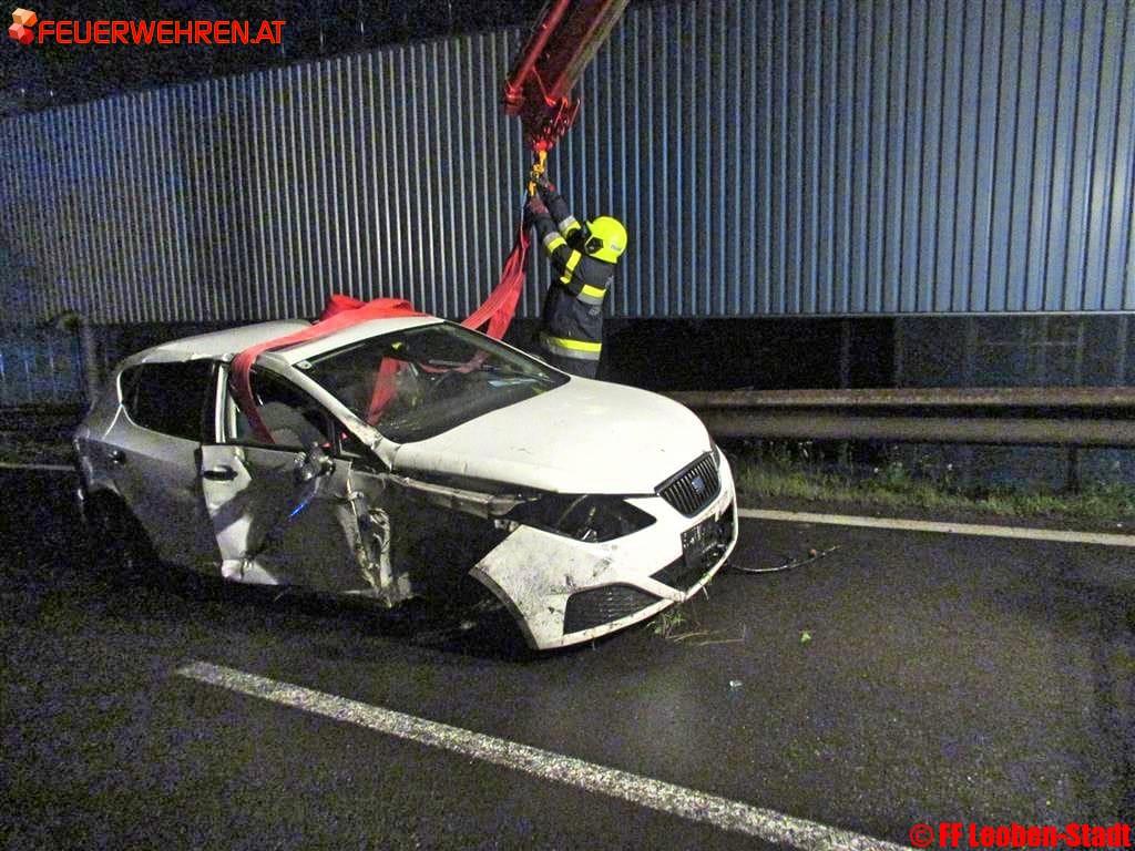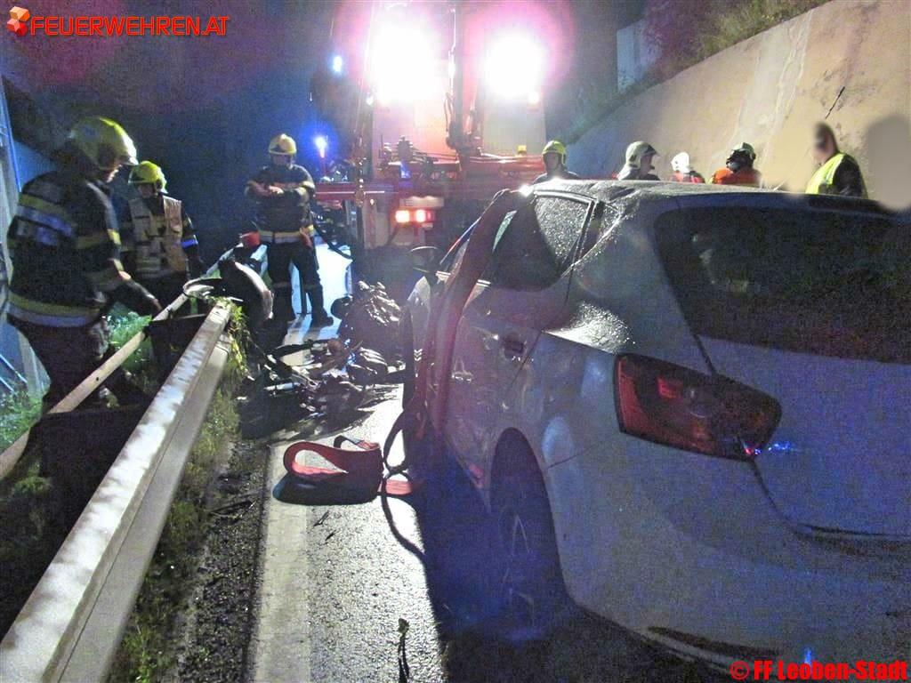Am 22.07.2018 um 21:48 Uhr alarmierte die Landesleitzentrale Florian Steiermark die Freiwillige Feuerwehr Leoben-Stadt und die Freiwillige Feuerwehr Leoben-Göß mit dem Alarmstichwort „T10-VU-eingekl.“ zu einem Verkehrsunfall mit eingeklemmter Person auf der B115a Höhe ehemalige Kühltürme. Aus unbekannter Ursache kam ein Fahrzeug von der Straße ab, beschädigte eine Halle der VOESTALPINE und kam in der Folge im Straßengraben zu stehen.