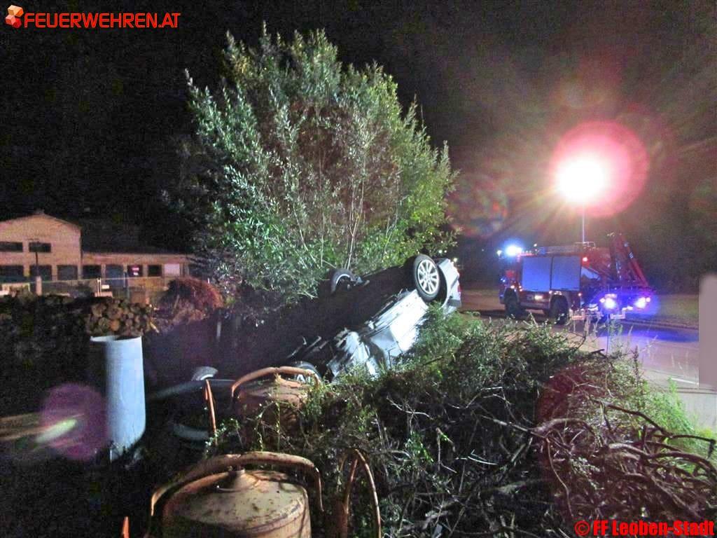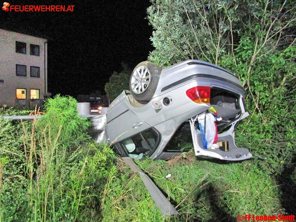 Am 30.07.2018 um 00:29 Uhr alarmierte die Landesleitzentrale Florian Steiermark die Freiwillige Feuerwehr Leoben-Stadt und die Freiwillige Feuerwehr Leoben-Göß mit dem Alarmstichwort „T03-VU-Berg.-Öl“ zu einem Verkehrsunfall in der Kerpelystraße. Aus unbekannter Ursache kam ein Fahrzeug von der Straße ab, riss eine Straßenlaterne um und kam im angrenzenden Grünstreifen am Dach zu liegen.