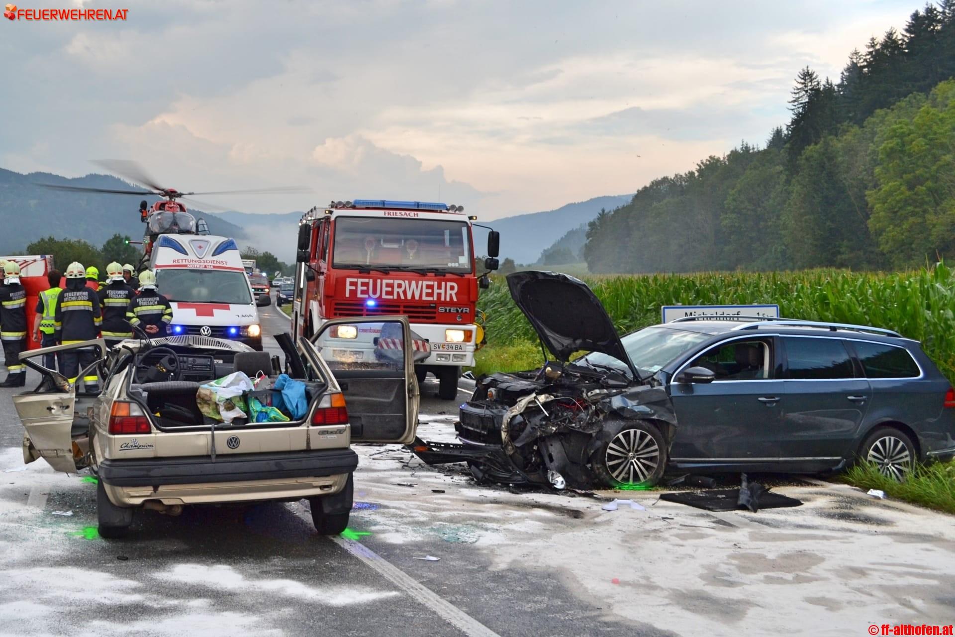 Um 17.36 Uhr wurden die Feuerwehren Althofen, Micheldorf und Friesach alarmiert. In Abstimmung mit dem anwesenden Notarzt wurde die Lenkerin von der FF Althofen mittels hydraulischem Rettungsgerät befreit. Alle Unfallbeteiligten erlitten Verletzungen unbestimmten Grades. Nach der Erstversorgung wurden sie u.a. mit dem Rettungshubschrauber RK 1 in das Krankenhaus gebracht.