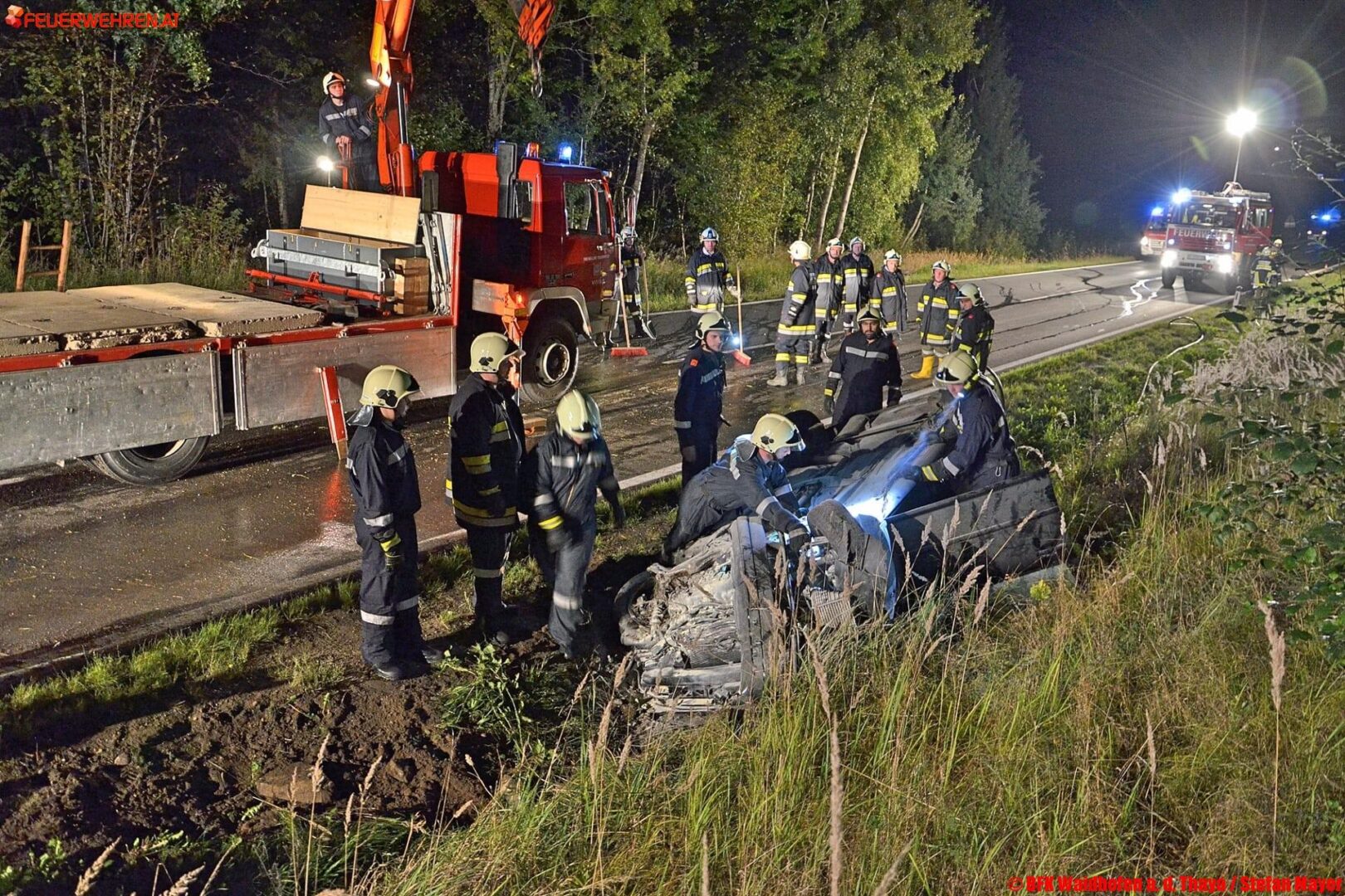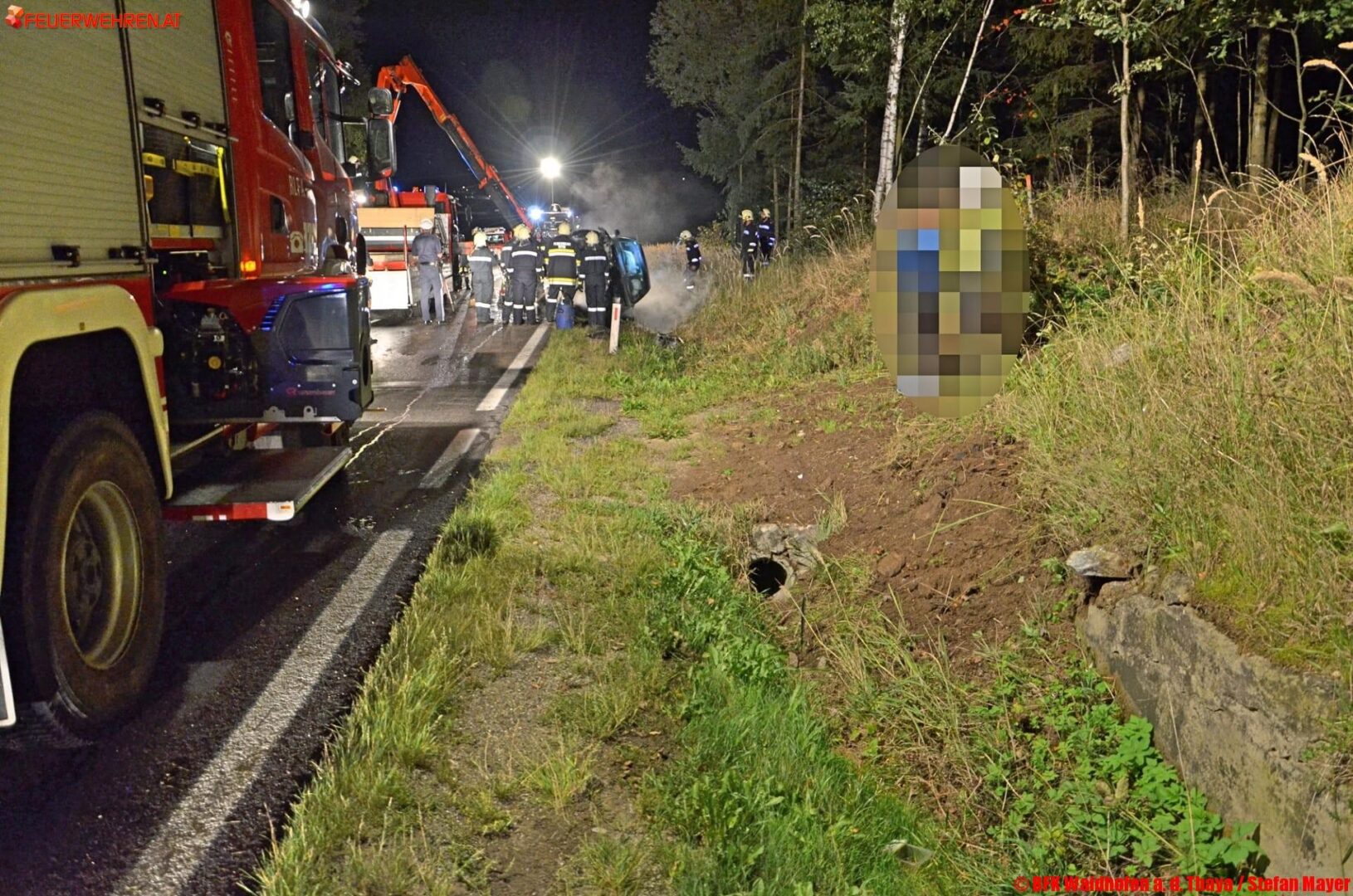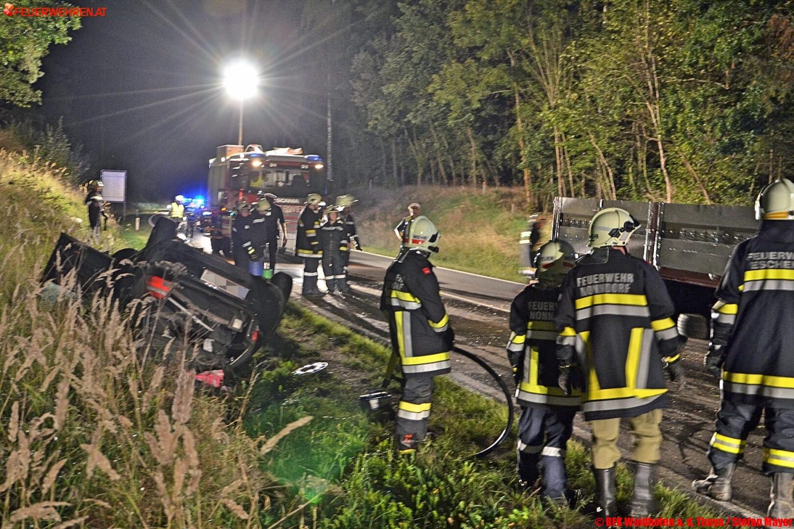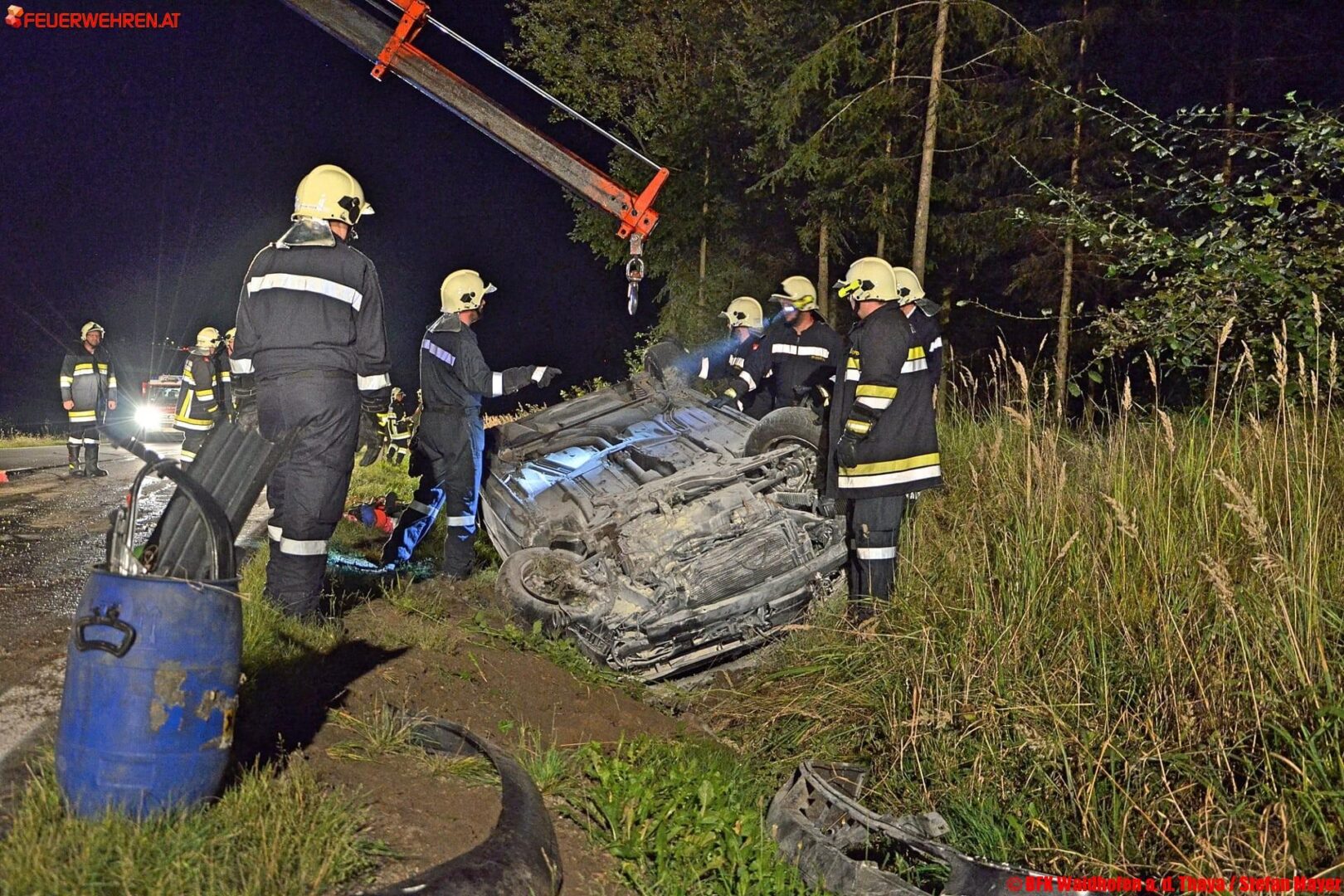 Eine Fahrzeuglenkerin fuhr gegen 20 Uhr von Vitis in Richtung Waidhofen und verlor am sogenannten „Schinterberg“ in einer Linkskurve die Kontrolle über ihr Fahrzeug. Der PKW schlitterte in den rechten Straßengraben und stieß gegen eine betonierte Feldzufahrt. Der Wagen überschlug sich anschließend und kam im rechten Straßengraben am Dach zum Liegen. Ein entgegenkommender LKW Lenker aus Tschechien bemerkte den Unfall und sah von dem Unfallfahrzeug Rauch aufsteigen. Er holte sofort den am LKW mitgeführten Feuerlöscher und verhinderte erfolgreich einen Fahrzeugbrand.