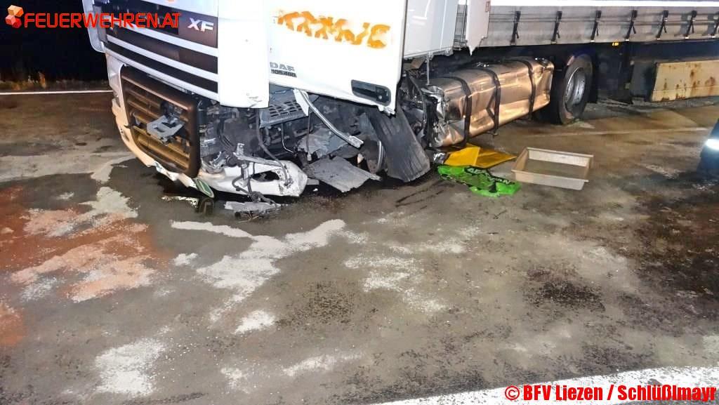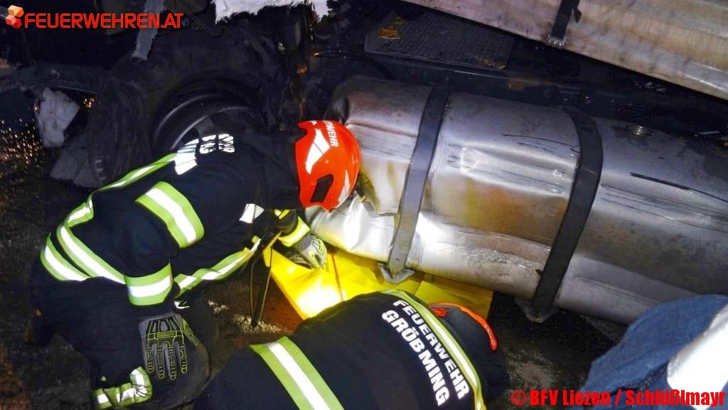 Der LKW-Lenker (slowenisches Kennzeichen) blieb unverletzt, aus dem LKW-Tank flossen etwa 300 Liter aus, ein großer Teil davon konnte von den Einsatzkräften aufgefangen bzw. gebunden werden. Aufgrund des Schadensausmaßes stand auch das Ölfahrzeug der FF Schladming im Einsatz. Die BH Liezen wurde verständigt, nach Schadenserhebung eines Spezialisten muss möglicherweise noch Chemiealarm gegeben werden.