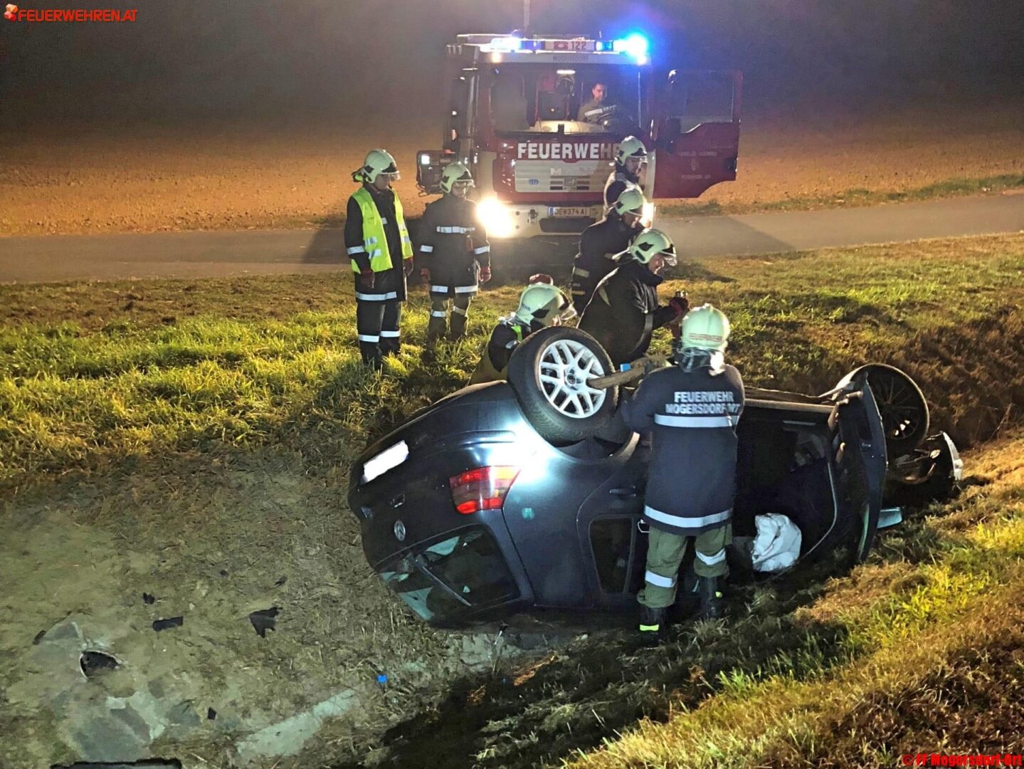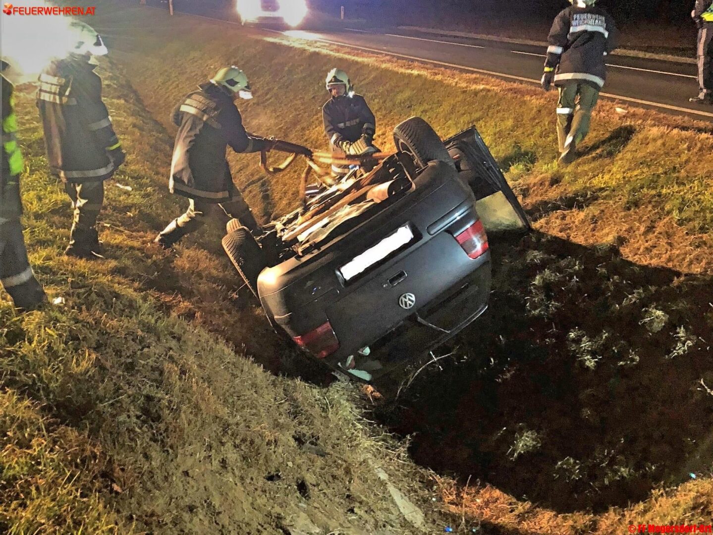 Aus ungeklärter Ursache kam das Fahrzeug mit drei Personen aus dem Bezirk Jennersdorf kurz vor Mitternacht von der Straße ab und überschlug sich. Die Insassen konnten sich allein aus dem auf dem Dach liegenden Wrack befreien. Eine Polizeistreife der Polizeiinspektion Jennersdorf alarmierte die Feuerwehr.