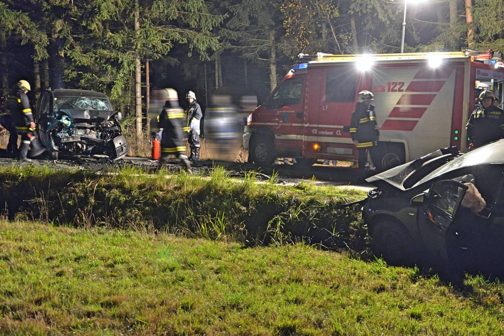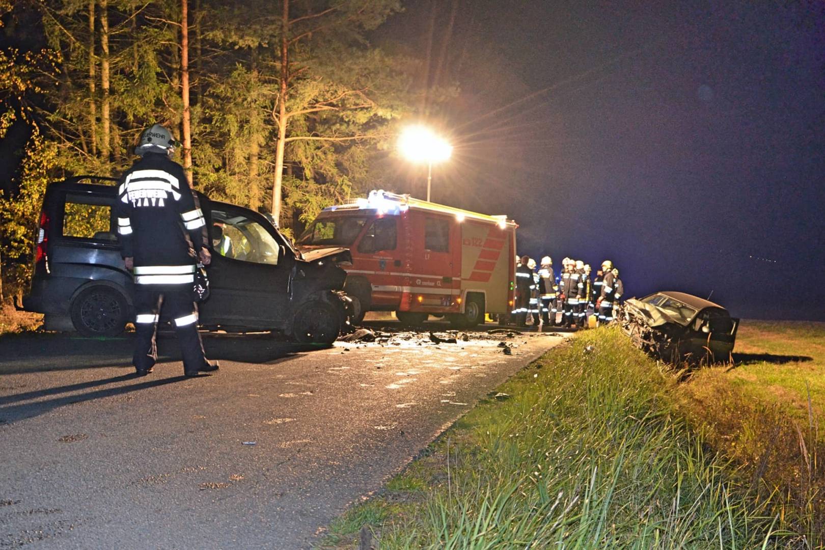 Der Unfall ereignete sich kurz nach 22 Uhr auf der Landesstraße 8164 zwischen Niederedlitz und Göpfritzschlag. Eine 23-jährige Frau lenkte ihren PKW von Niederedlitz kommend Richtung Göpfritzschlag. Ihr kam ein 37-jähriger Mann mit seinem PKW entgegen. Bei Kilometer 3,45 kam es zur Frontalkollision. Durch den Zusammenstoß wurde das Fahrzeug der Frau rückwärts in den Straßengraben geschleudert, das zweite Fahrzeug kam auf der Fahrbahn zum Stillstand. Ein nachkommender PKW Lenker – ein Feuerwehrmann aus der Gemeinde Karlstein – leistete sofort Erste-Hilfe.