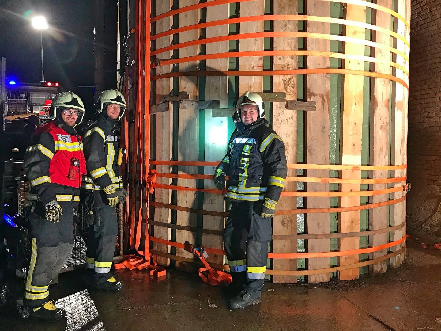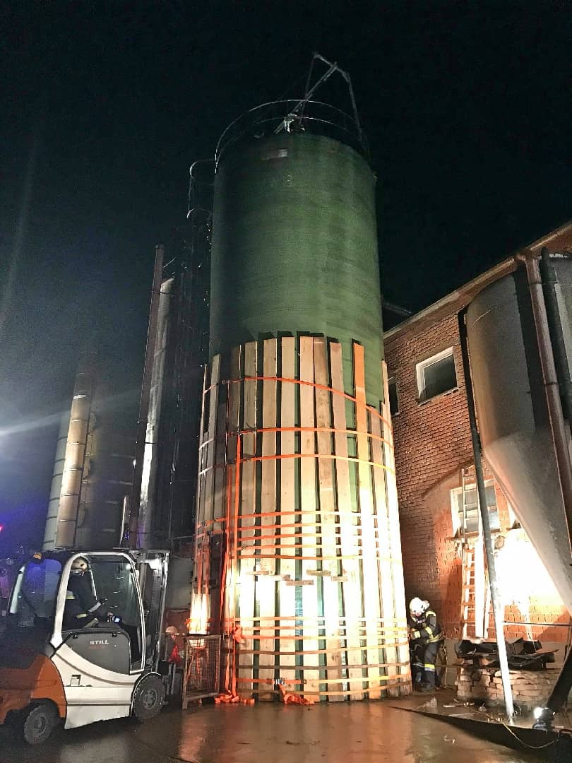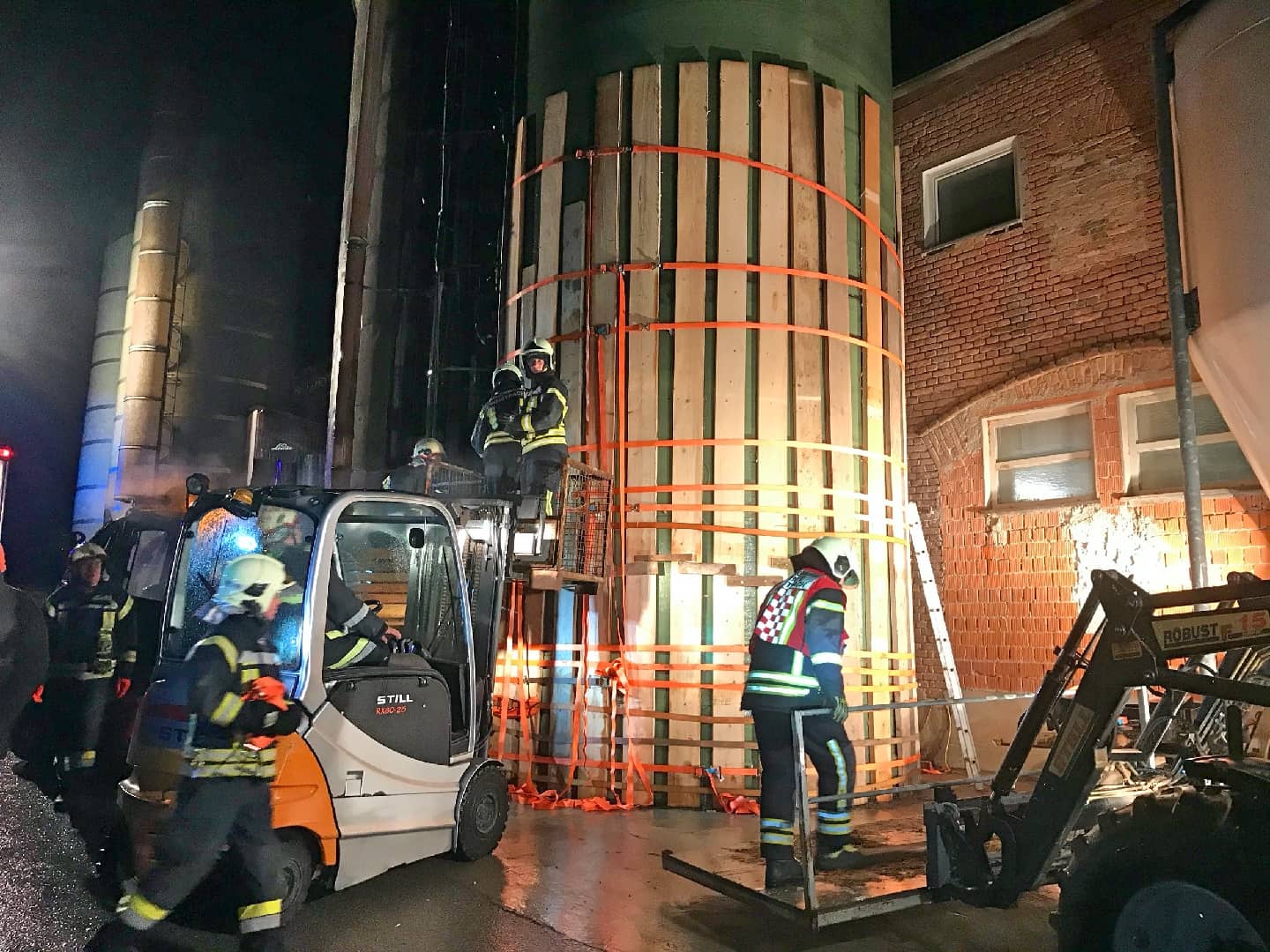 Nach der Lageerkundung des Einsatzleiters entschied man sich den Silo mit Pfosten und Spanngurten zu stabilisieren. Nachdem alle Materialien herangefahren wurden konnten die Pfosten an den Silo gestellt werden. Anschließend mussten aufgrund des Durchmessers immer zwei Spanngurte zusammengehängt werden um rund um den Silo zu kommen. Insgesamt wurden 30 Spanngurte und 30 Pfosten zur Sicherung verwendet. In weiterer Folge wurde ein Sachverständiger informiert um den Silo zu begutachten.