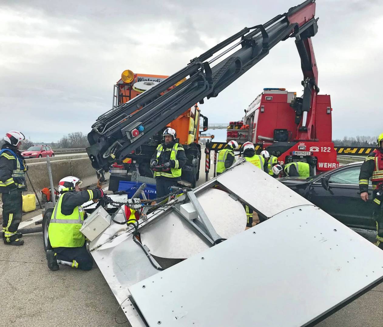 Mit einem hydraulischen Kombigerät, einem Motortrennschleifer sowie dem Kran des schweren Rüstfahrzeuges wurde der Absicherungsanhänger vom Zugfahrzeug getrennt. In weiterer Folge wurde der völlig zerstörte Anhänger mit dem Kran des Wechselladerfahrzeuges auf dessen Plateau verladen und abtransportiert.