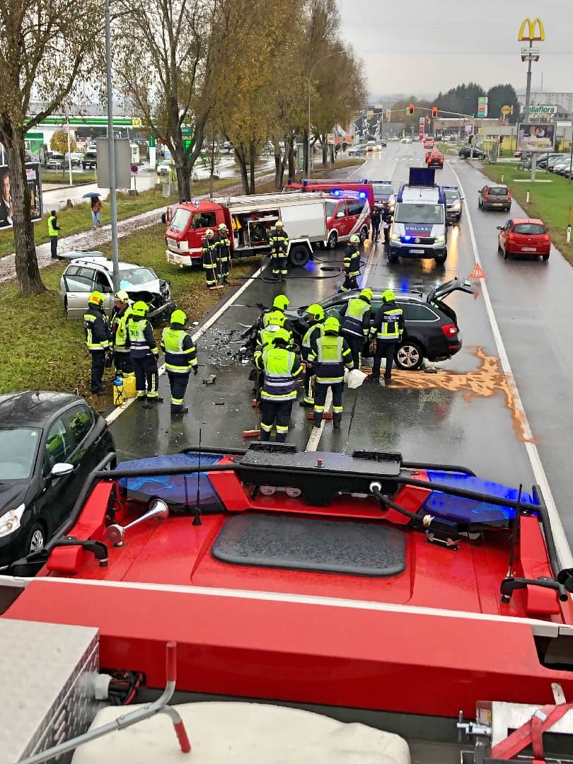 Die Aufgabe der Feuerwehr beschränkte sich daher auf das Absichern der Unfallstelle, Aufbau des Brandschutzes sowie das Binden von Betriebsmitteln. Durch den Unfall war die erste Fahrspur für den Verkehr stadtauswärts gesperrt. Nach der Unfallaufnahme und Freigabe durch die Polizei wurden die beiden Fahrzeuge bis zum Eintreffen des privaten Abschleppunternehmens auf der ersten Fahrspur abgestellt und die Straße gereinigt.