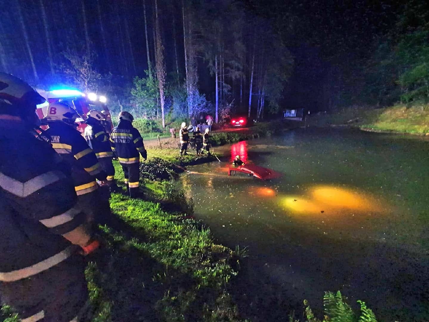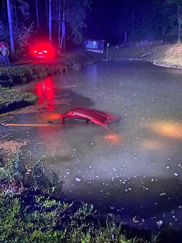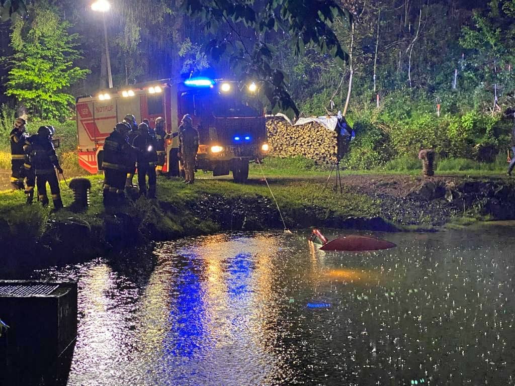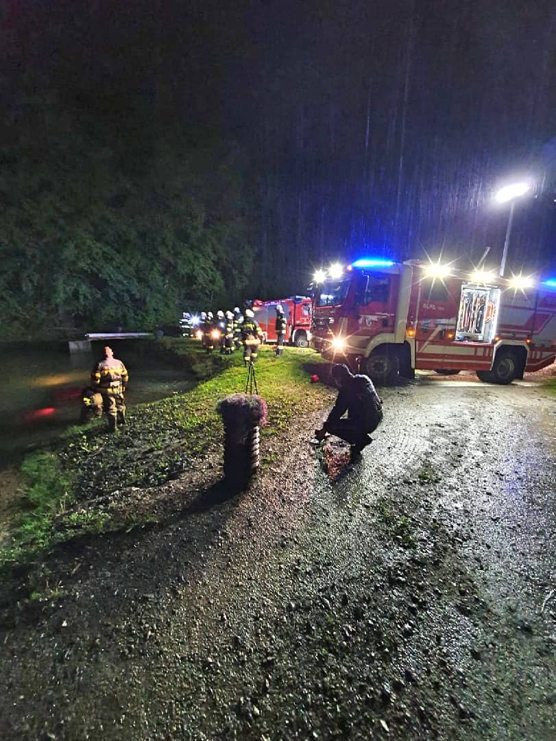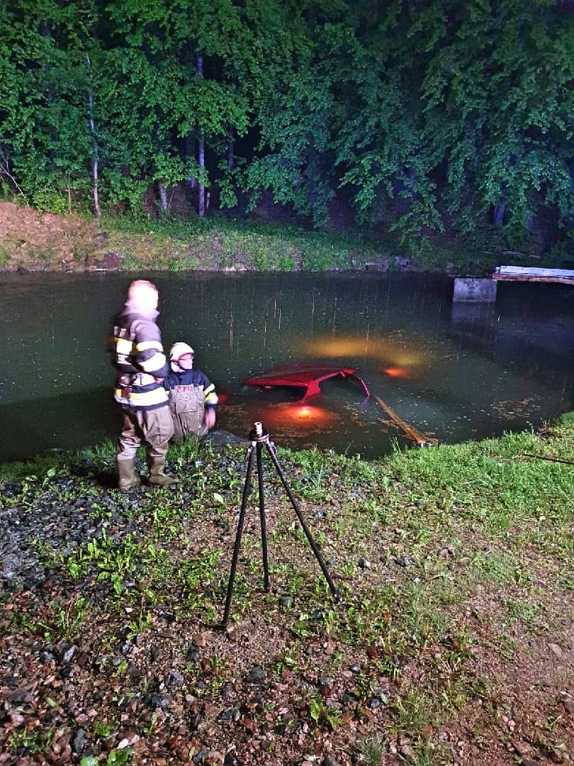 Am Einsatzort angekommen wurde nach der Erkundung durch den Einsatzleiter diese Vorahnung bestätigt. Ein Fahrzeug ist aus noch ungeklärter Ursache auf der regennassen Fahrbahn von der Straße abgekommen und in einem angrenzenden Teich zum Stillstand gekommen. Der Fahrzeuglenker konnte sich selbst aus dem sinkenden Kleinwagen befreien, bevor dieser vollkommen unter der Wasseroberfläche verschwand.