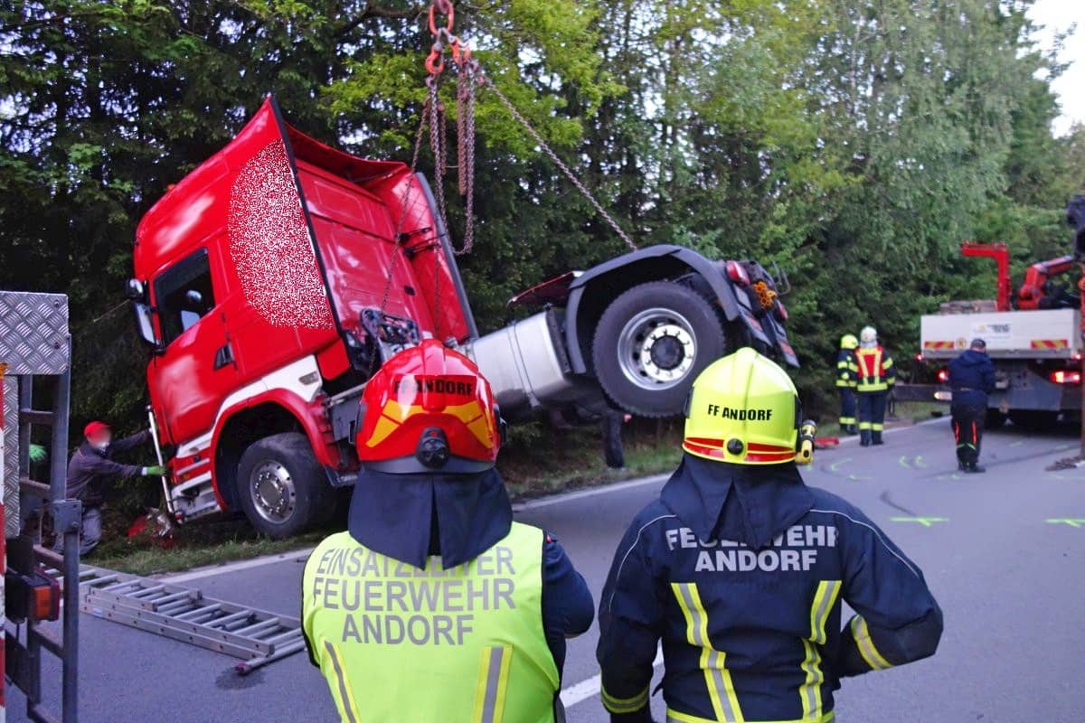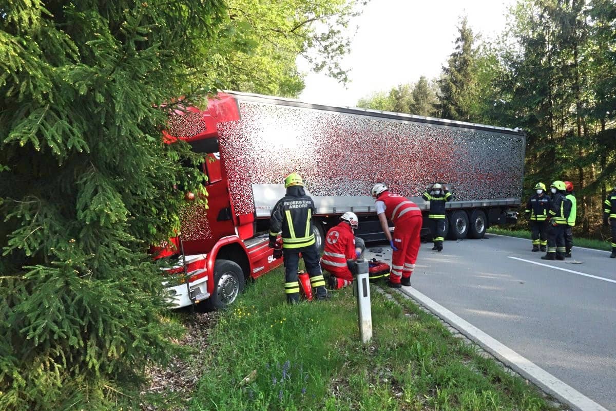 Beide Fahrzeuge landeten nach dem Zusammenstoß im Straßengraben. Der Lenker des PKWs wurde dabei schwer verletzt und musste von der Rettung nach der Erstversorgung ins Krankenhaus gebracht werden. Der unverletzt gebliebene LKW-Lenker hatte dabei Glück im Unglück: Die Zugmaschine kam wenige Zentimeter vor einer Baumreihe am Straßenrand zum Stehen.