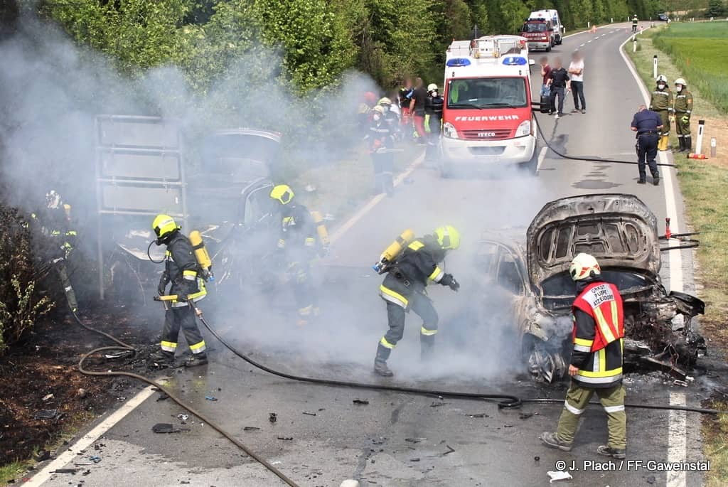 Beim Eintreffen an der Unfallstelle stellte sich folgende Lage: Zwei Pkws waren frontal zusammengestoßen und in Brand geraten. Ein Fahrzeug stand bereits in Vollbrand. Weiters breitete sich das Feuer auf den danebenliegenden Wald aus. Daher wurde bereits bei der Anfahrt auch die FF Ladendorf nachalarmiert.