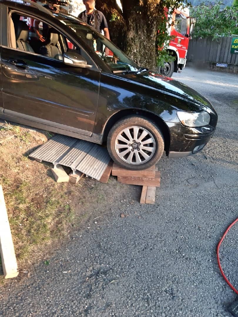 Da das Fahrzeug auf der Böschungskante aufsaß, musste der PKW mit einem Hebekissen angehoben und in weitere Folge ein entsprechender Unterbau mit Rüsthölzern und einer Schlauchbrücke errichtet werden. Im Anschluss daran konnte das Fahrzeug mittels Greifzug wieder auf den befestigten Parkplatz zurückgezogen werden.