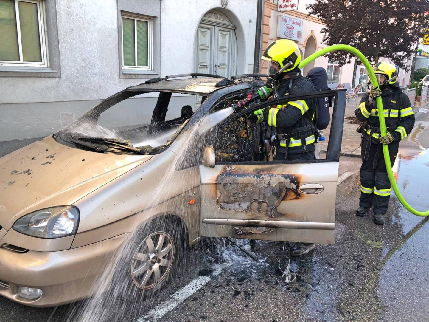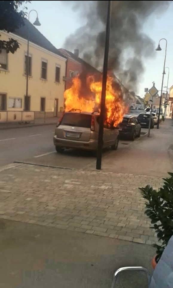 Exakt sieben Minuten später, um 18:42 Uhr, folgte der nächste Einsatz, ein PKW Brand auf der Hauptstraße. Gemäß Meldebild wurden neben der Feuerwehr Himberg auch die Feuerwehren Pellendorf und Ebergassing alarmiert.