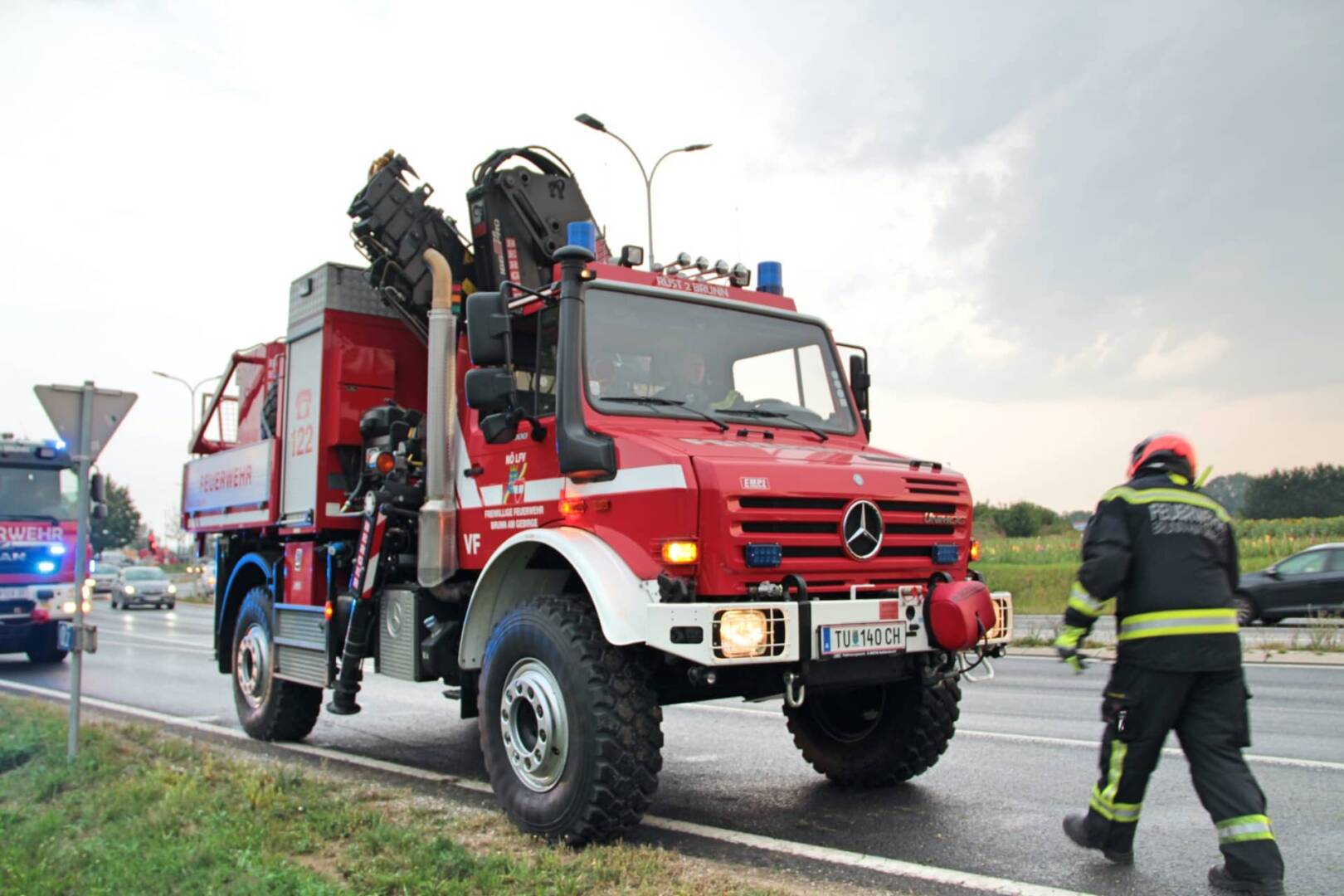 Bereits wenige Minuten nach der Alarmierung um 07:04 Uhr setzte sich der technische Zug der Freiwilligen Feuerwehr Brunn am Gebirge mit drei Fahrzeugen zur Einsatzstelle in Bewegung, wo die Einsatzkräfte umgehend mit der Arbeit beginnen konnten. Da es aufgrund des Gewichtes des Unfallfahrzeuges und dessen Lage an einer kleinen Böschung nicht möglich war dieses händisch aufzurichten, entschied der Einsatzleiter das Fahrzeug zuerst mittels Seilwinde von „Rüst 2 Brunn“ im direkten Zug von einem angrenzenden Wegweiser wegzuziehen. Anschließend wurde am Heck von „Rüst 1 Brunn“ eine Umlenkrolle angebracht und das verunfallte Fahrzeug im indirekten Zug seitlich aufgerichtet.
