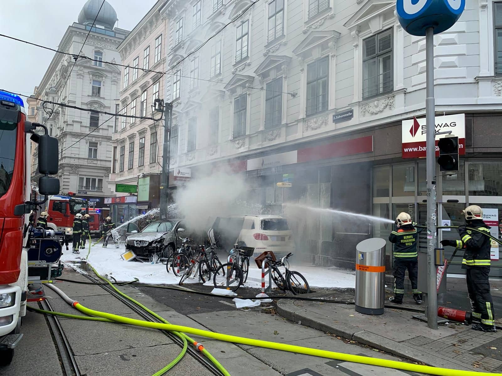 Von der Berufsfeuerwehr Wien wurde eine Löschleitung unter Atemschutz zur Brandbekämpfung des Unfallfahrzeuges eingesetzt und mit einer weiteren Löschleitung ein Übergreifen der Flammen auf das Gebäude verhindert. Da der Treibstofftank von einem der Pkw aufgerissen war, breiteten sich die Flammen rasant aus. Die Brandbekämpfung gestaltete sich schwierig, weshalb Löschschaum eingesetzt werden musste.