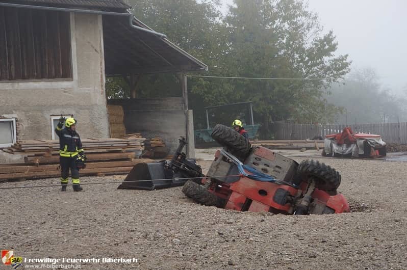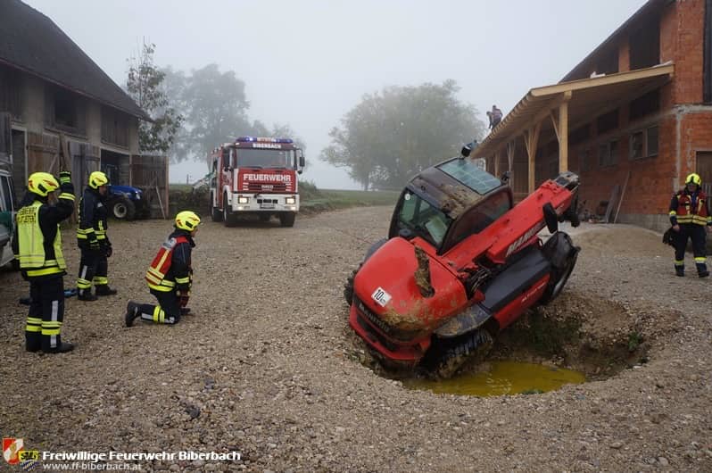 Zum ersten Einsatz des Vormittag wurden die Feuerwehrmitglieder um ca. 8:45 Uhr zu einem landwirtschaftlichen Betrieb gerufen. Beim Rangieren übersah der Lenker eines Teleskopladers eine ca. 1 Meter tiefe Grube und geriet in diese, woraufhin der Lader umstürzte. Glücklicherweise wurde der Lenker dabei nicht verletzt und konnte das Fahrzeug selbstständig verlassen.