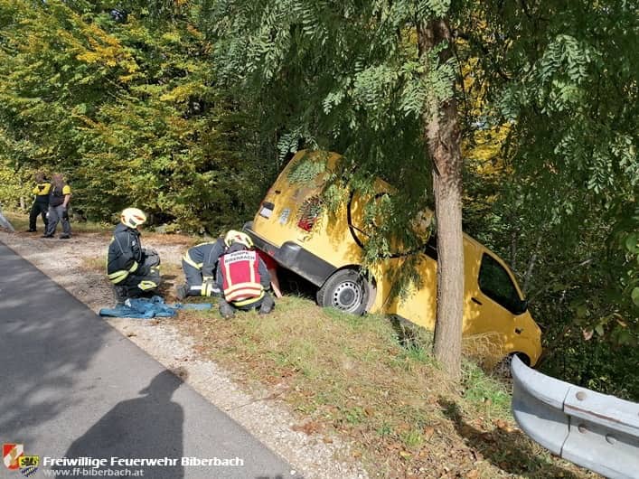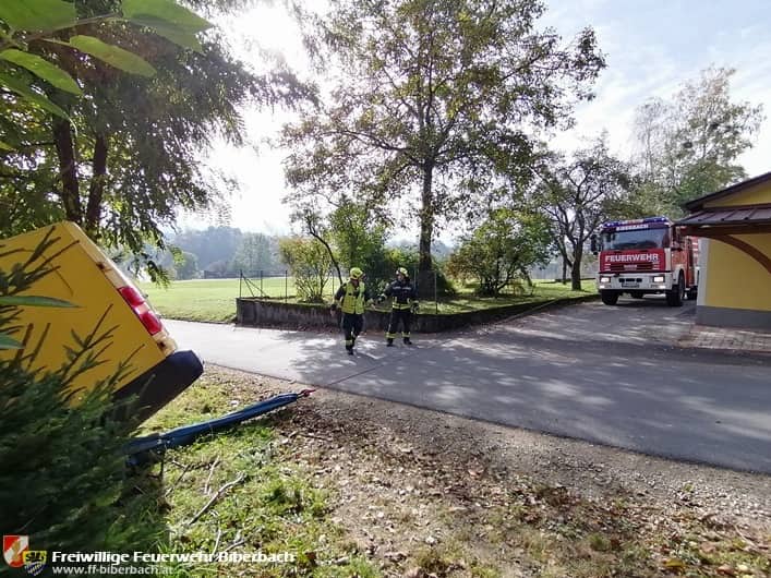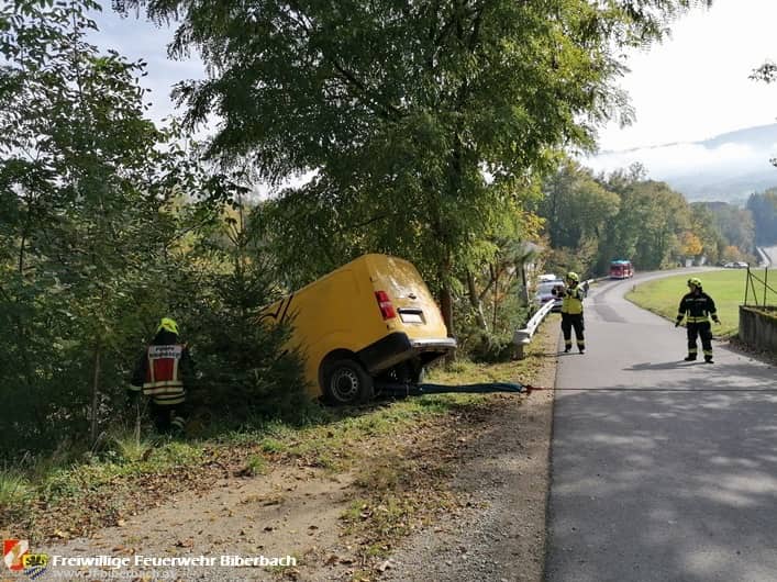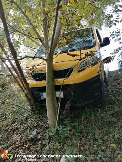 Um 11:20 Uhr wurden die Biberbacher Feuerwehrmitglieder abermals zu einem Bergungseinsatz gerufen. Im Bereich Gstadthof machte sich ein Lieferwagen selbstständig und rollte über die Landesstraße hinweg über eine Böschung. Glücklicherweise wurde das Fahrzeug rasch von Bäumen gestoppt, wodurch ein Absturz über den steilen Abhang verhindert wurde.