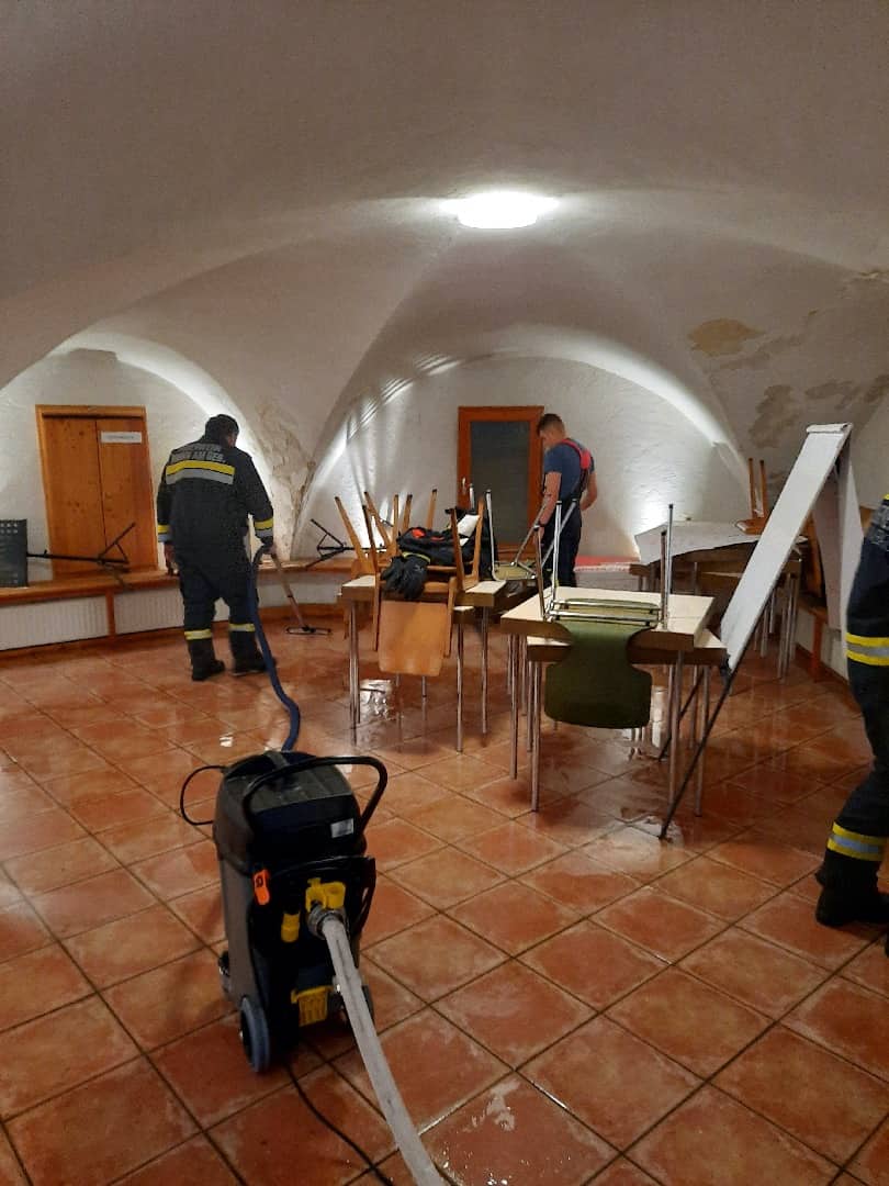 Noch während der Rettungsdienst die beiden Verletzten versorgte, verständigte Feuerwehrkurat Mag. Adolf Valenta seine Kameraden über einen Wasserschaden in der Krypta der Pfarrkirche Brunn am Gebirge. Da die Bergung des Unfallfahrzeuges auf der B12 von den Kameraden der Feuerwehr Perchtoldsdorf übernommen wurde und ein sich im Staubereich der Gegenfahrbahn ereigneter Auffahrunfall keinen Einsatz der Feuerwehr notwendig machte, begaben sich die Brunner Kräfte umgehend zur Kirche wo sogleich mit der Beseitigung des Wasserschadens mittel Nass-Trocken-Sauger begonnen werden konnte.