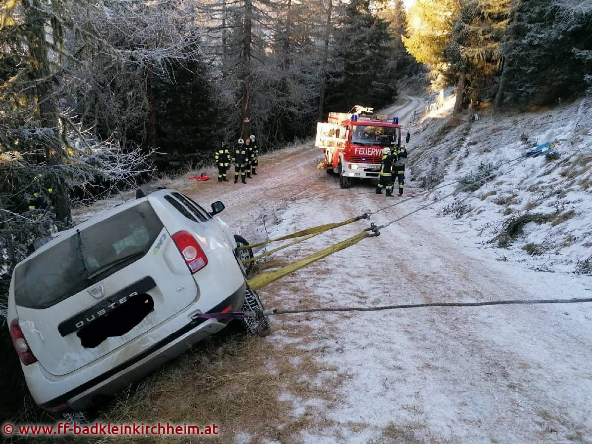 Am 1. Adventsonntag 2020 wurde die Feuerwehr Bad Kleinkirchheim gegen 14:11 Uhr mittels Sirenenalarm zu einer Fahrzeugbergung alarmiert. Ein PKW rutschte auf der Maibrunn (ca. 1800m Seehöhe) von der Fahrbahn über die Böschung ab und blieb in einer Baumgruppe hängen.