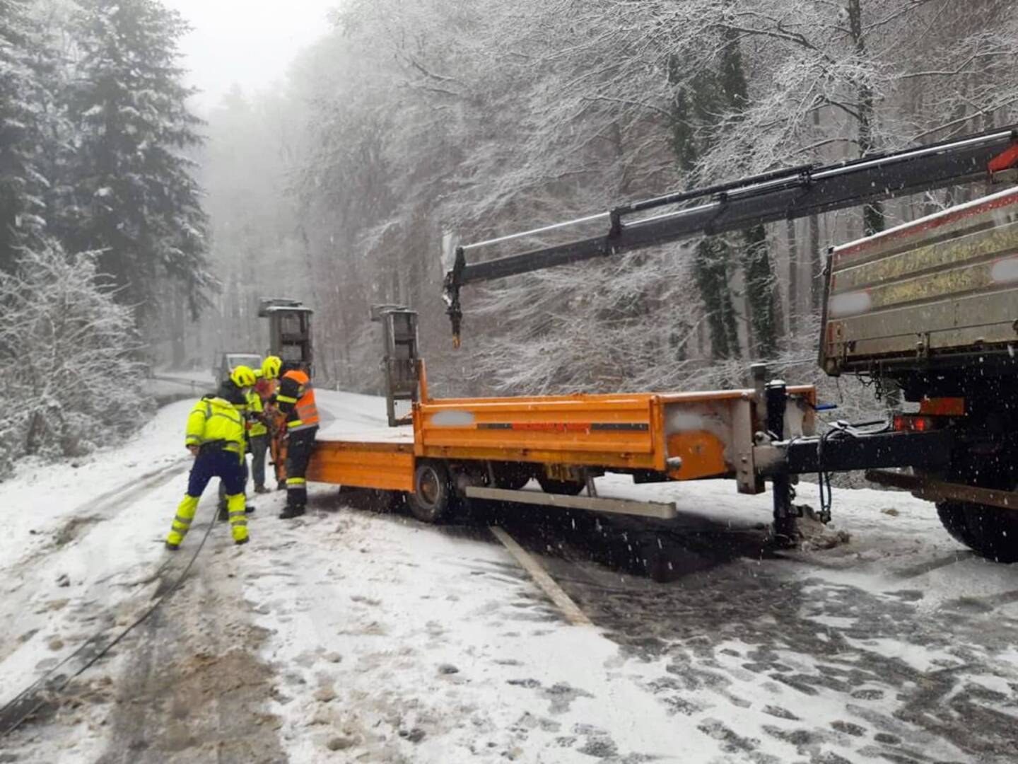 Der erste Lkw kam am Vormittag kurz nach 9.30 Uhr schon am ersten Riegel auf der L212 in Reichersdorf (Gemeinde St. Stefan/R.) nicht mehr weiter. Die Feuerwehr St. Stefan im Rosental musste den Lkw mit Tieflader absichern. Er drohte sogar abzurutschen. Die Feuerwehr musste den Tieflader abhängen.