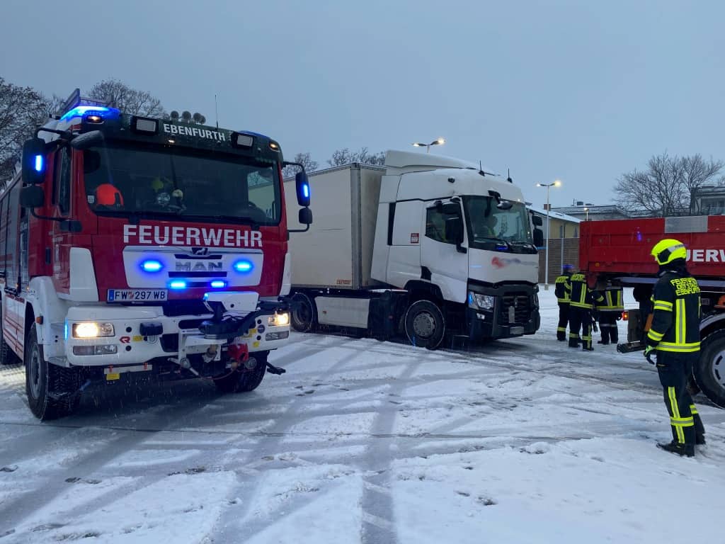 Noch während der Aufräumungsarbeiten wurden die eingesetzten Kräfte über Funk zu einem hängengebliebenen Sattelschlepper auf die Brücke B60 beordert. Der verkehrsbehindernd stehende LKW wurde rasch mittels WLF-Kran über die Eisenbahnüberführung bis zu einem Supermarktparkplatz geschleppt und der Polizei übergeben. Leider war der Lenker mit Sommerreifen an der Antriebs-Achse und ohne Schneeketten unterwegs.