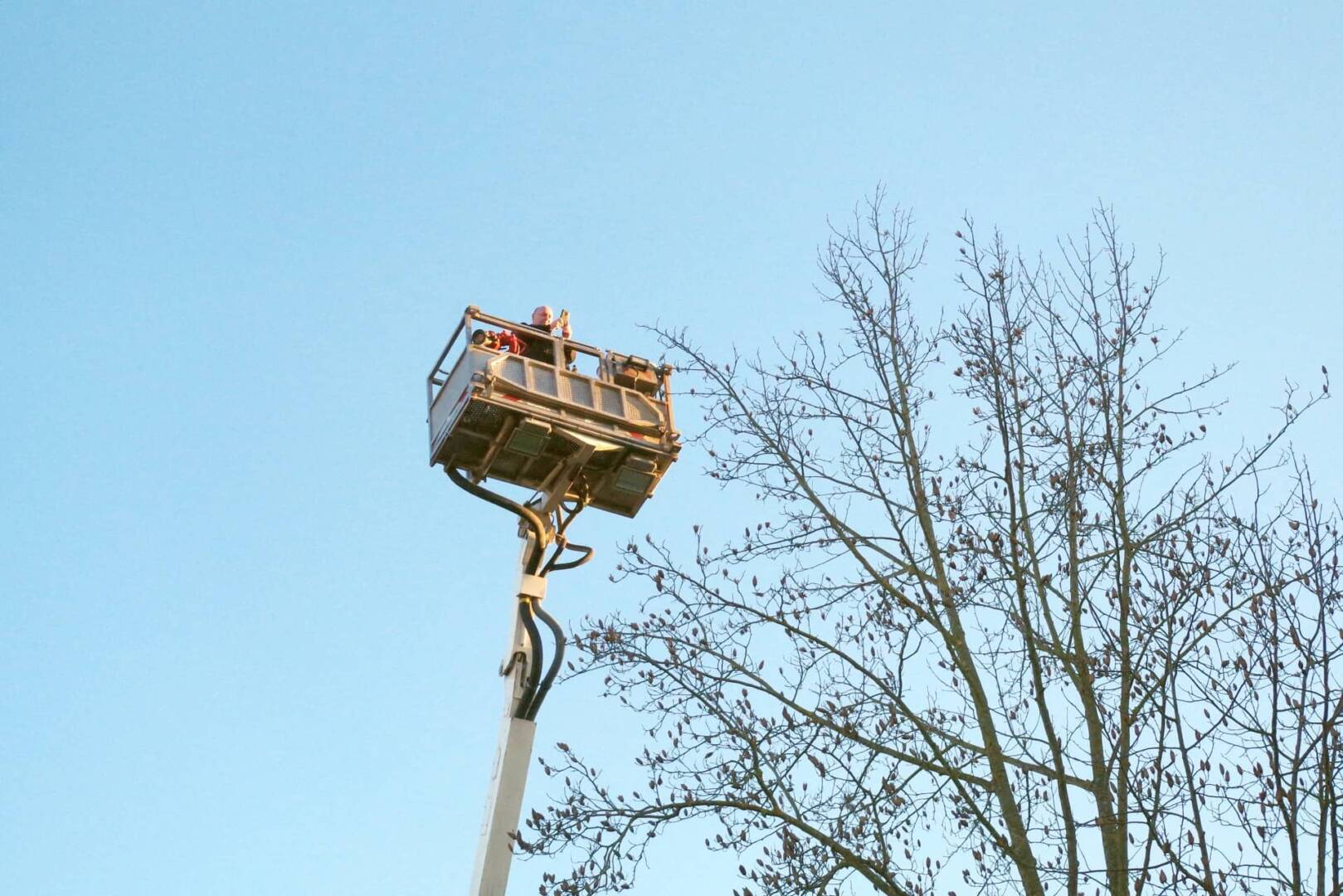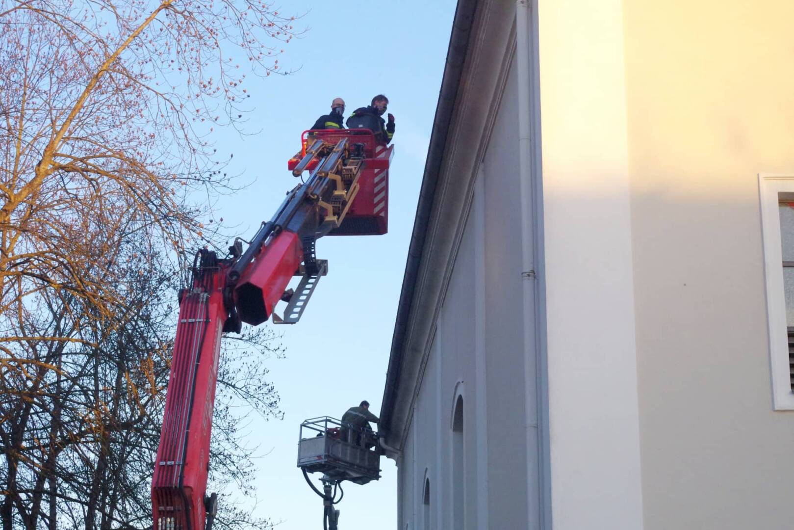 Mit dem Kranfahrzeug und der Teleskopmastbühne säuberten zwei Trupps in teilweise schwindelerregender Höhe die Regenrinnen und Abläufe. Nach der Reinigungsaktion machte sich Stadtpfarrer Brei selbst ein Bild vom „Erfolg“ der Reinigungsaktion und stieg mit der Hebebühne in 31 Meter Höhe auf.