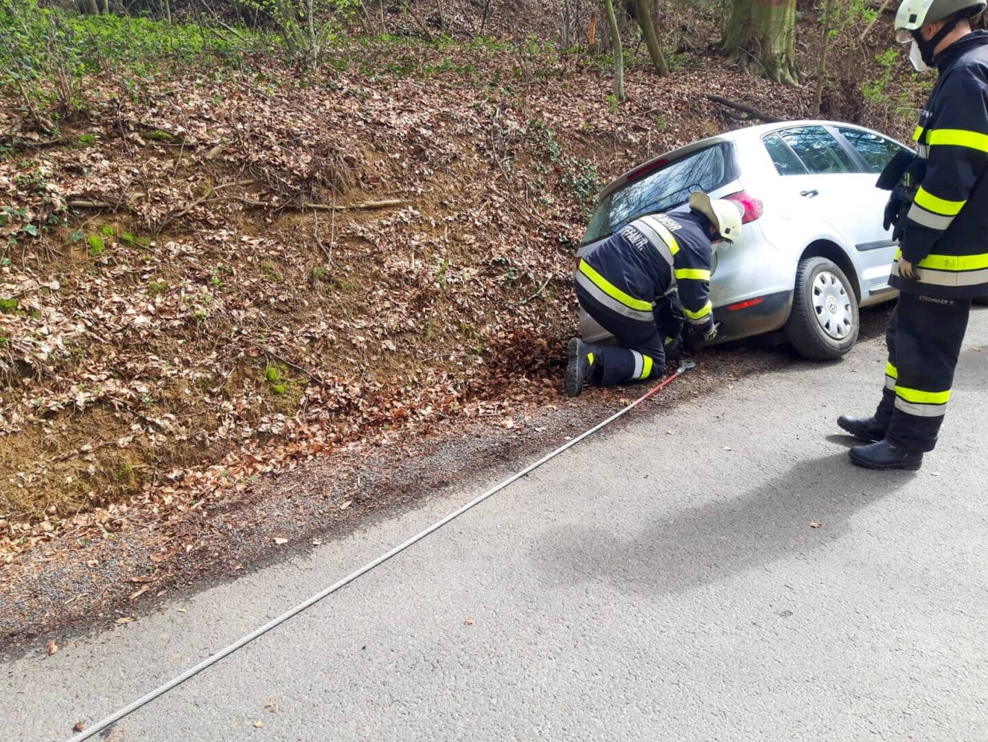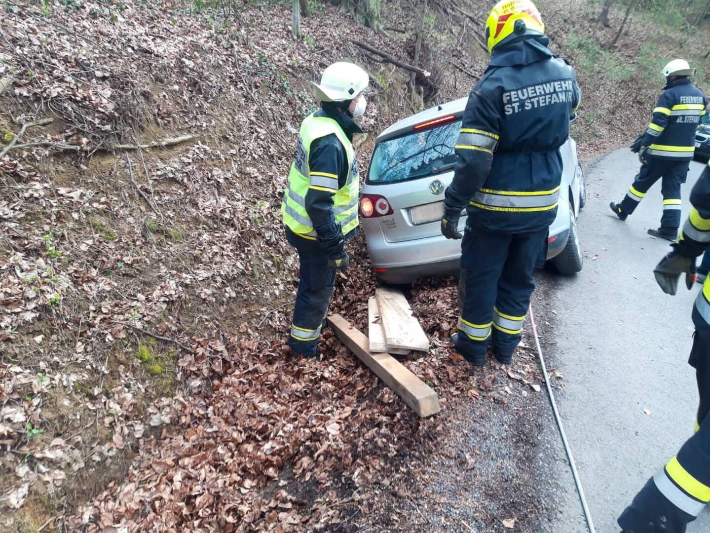 Am 3. April um 14:06 Uhr wurde die Freiwillige Feuerwehr St. Stefan im Rosental zu einer Fahrzeugbergung nach Schichenau (Ortsteil St. Stefan/R) alarmiert. Ein südoststeirischer Pensionist war mit seinem PKW am Weg zur Kirche, als er bemerkte, dass er sein Portmonee zuhause vergessen hatte. Der Herr drehte mit seinem Gefährt sofort um und übersah dabei den angrenzenden Straßengraben, welcher mit Laub vollkommen bedeckt war. Leider blieb er mit der linken Fahrzeugseite hängen und musste die Feuerwehr alarmieren.