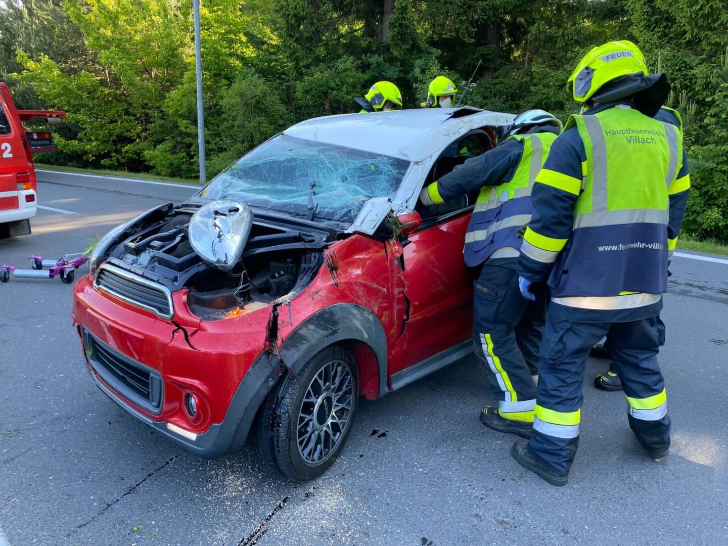Ersten Informationen zufolge, dass noch eine Person im Fahrzeug eingeklemmt ist, konnte nach dem Eintreffen des technischen Rüstzuges unserer Wache widerrufen werden. Die Person konnte sich mit Hilfe von Ersthelfern selbst aus dem deformierten Fahrzeug befreien und wurde am Straßenrand erstversorgt, berichtet HBI Harald Geissler, Kommandant der Hauptfeuerwache Villach.
