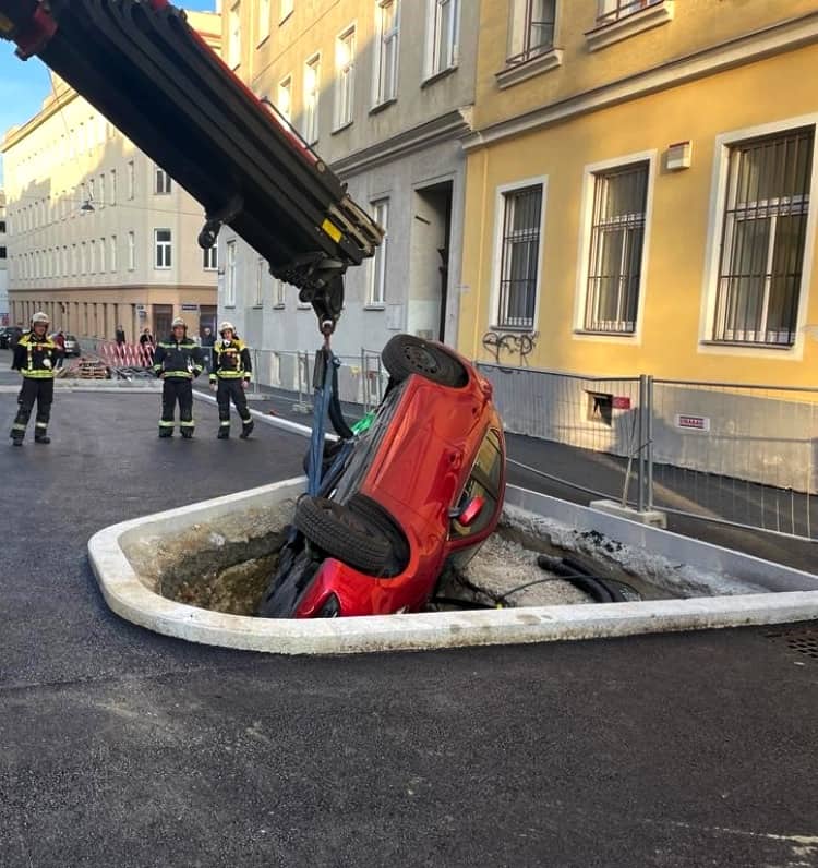 In der gerade im Umbau befindlichen Deinhardsteingasse in Wien – Ottakring kam die Lenkerin eines Fahrzeuges von der Fahrbahn ab, fuhr über das Randsteinpflaster und stürzte in die ca. 1,8 Meter tiefe Baugrube, die zur Pflanzung eines Baumes vorbereitet war. In dieser verlaufen auch eine Strom- und Gasleitung. Das Fahrzeug kippte und kam auf der Fahrerseite zu liegen. Die Frau blieb bei dem Unfall unverletzt und konnte ihr Fahrzeug selbstständig verlassen.