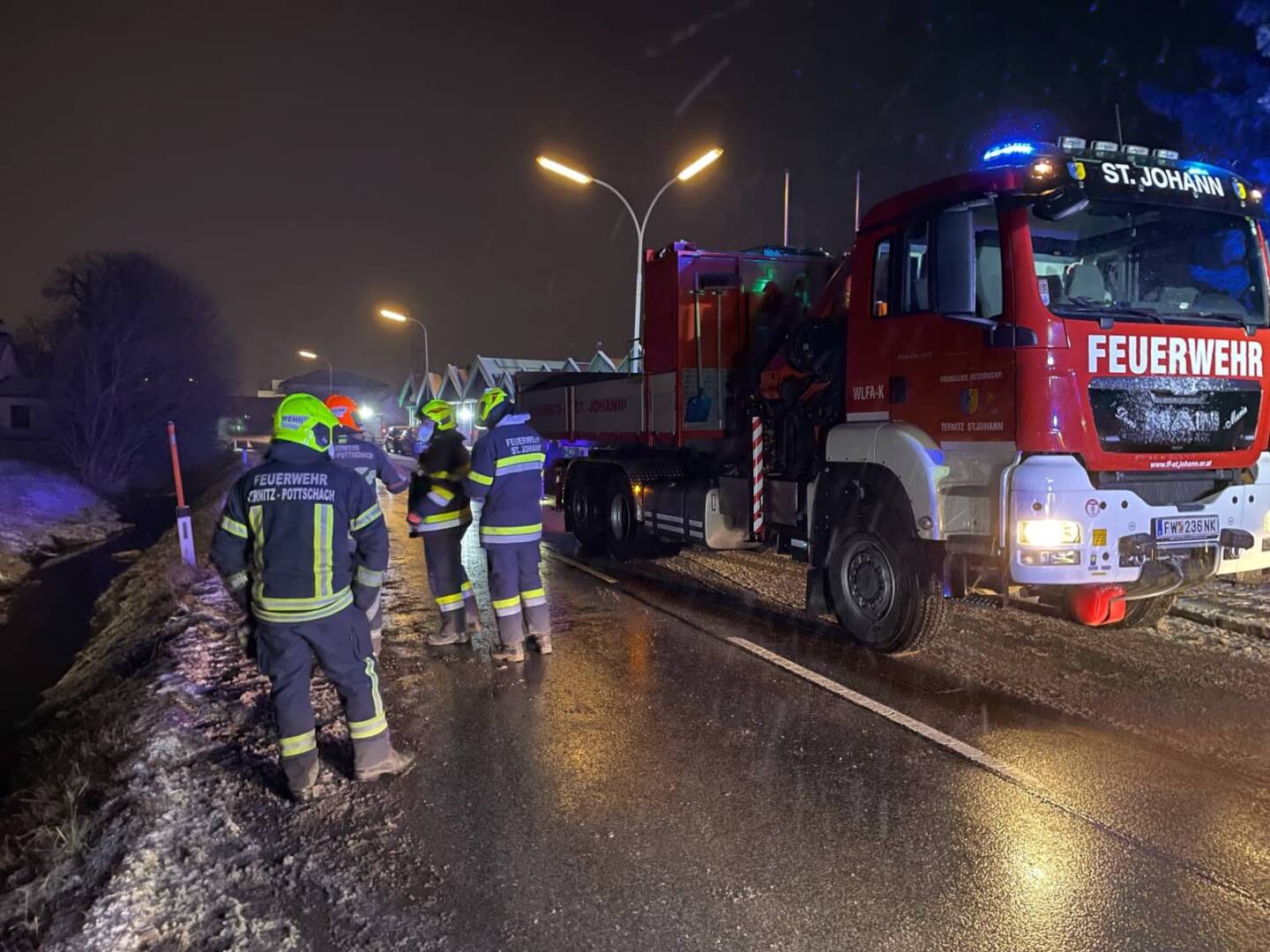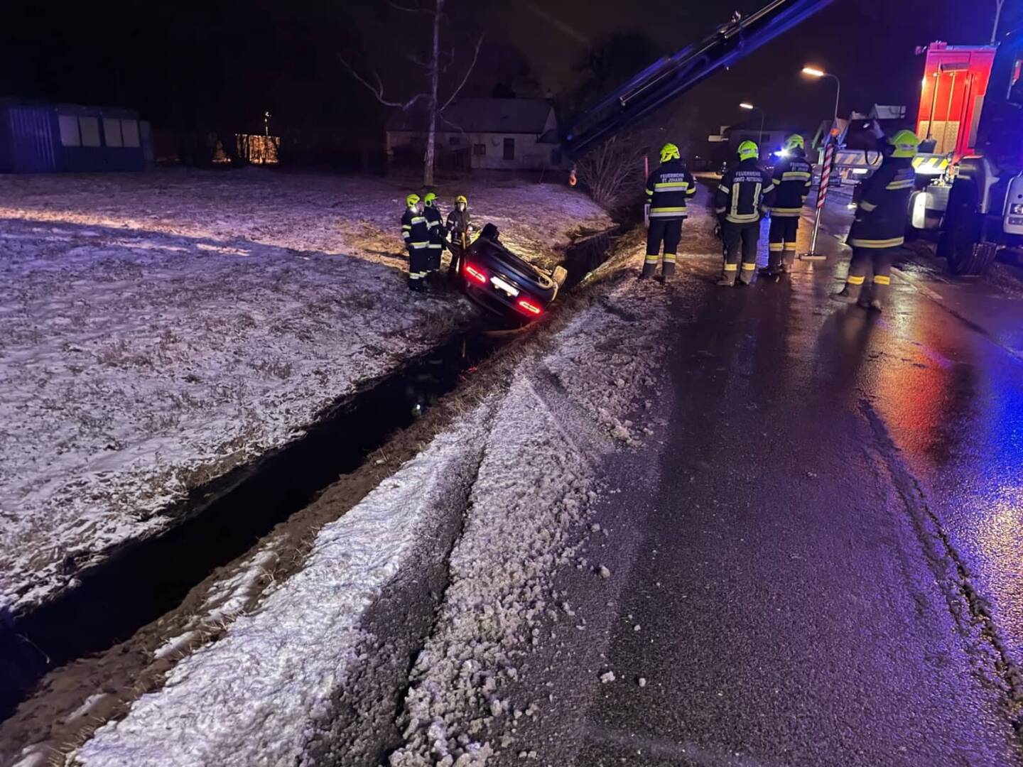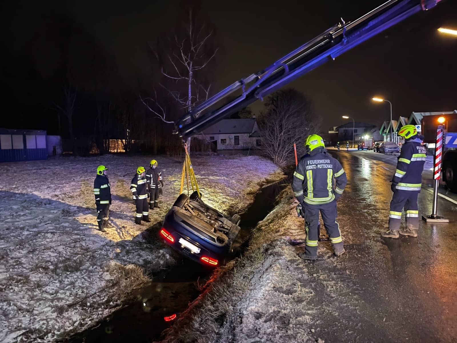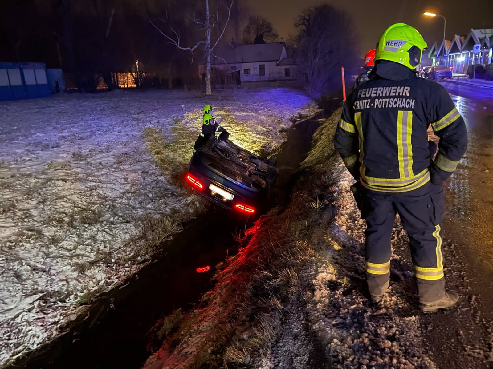 Zu einem nicht alltäglichen Einsatz, wurde die Feuerwehr Ternitz-Pottschach am 20.Jänner kurz vor 23 Uhr nach Pottschach, nähe des Bahnhofs Pottschach gerufen. Am Einsatzort angekommen staunten die Einsatzkräfte, da ein Fahrzeug in den Straßengraben rutschte und am Dach im wasserführenden Überlauf des Werkskanals zu liegen kam.