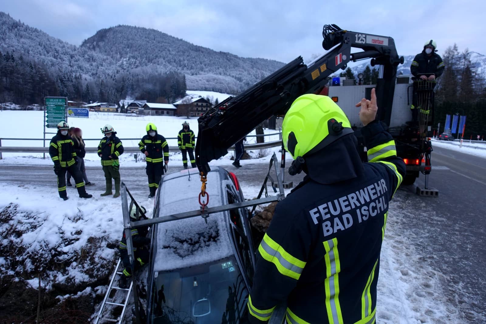 Zur Unterstützung einer Fahrzeugbergung im Gemeindegebiet von St. Wolfgang wurden heute Morgen die Kameraden des 1. Bereitschaftszuges der Hauptfeuerwache Bad Ischl alarmiert. Eine Lenkerin kam mit ihrem Fahrzeug im Bereich des Hotel Bürglstein von der Fahrbahn ab und stürzte in den neben der Fahrbahn befindlichen Tiefenbach. Die Lenkerin sowie die Beifahrerin blieben glücklicherweise unverletzt.