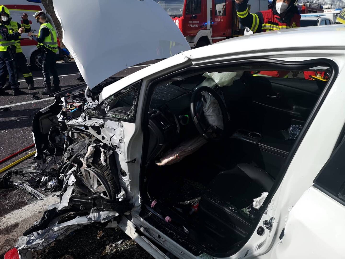 Bei einem PKW handelte es sich um ein Hybridfahrzeug. Dieses stromlos zu machen – um weder den eingeklemmten Lenker, noch die Rettungskräfte zu gefährden – gestaltete sich als nicht einfach.
