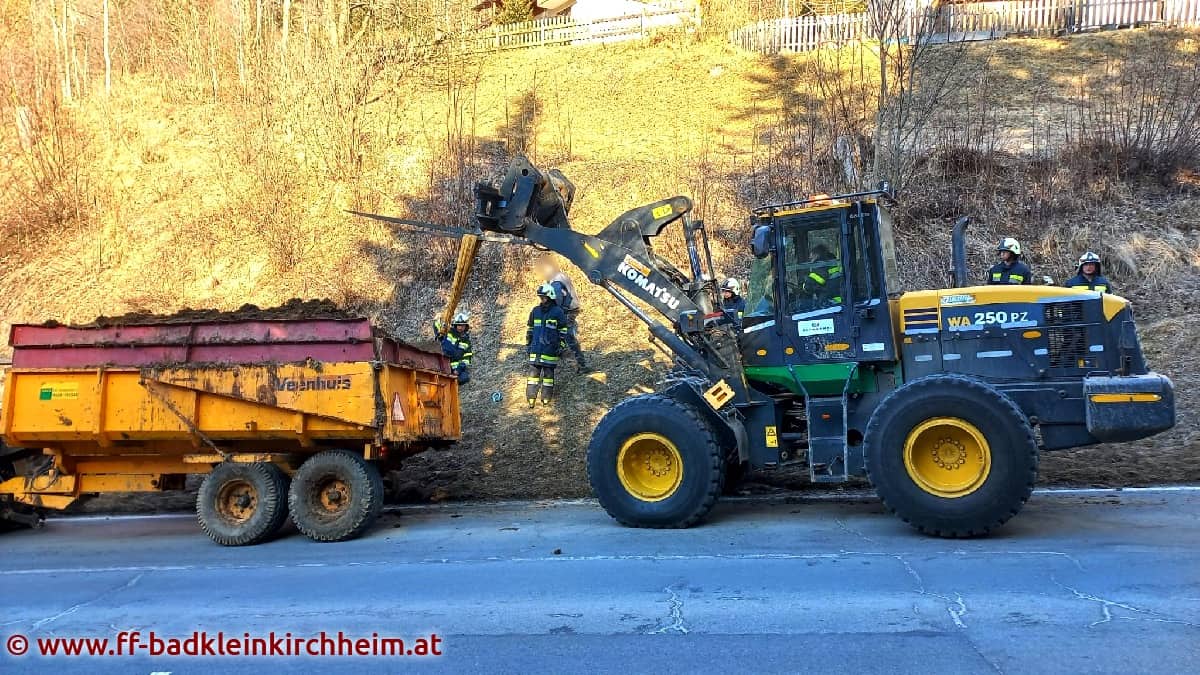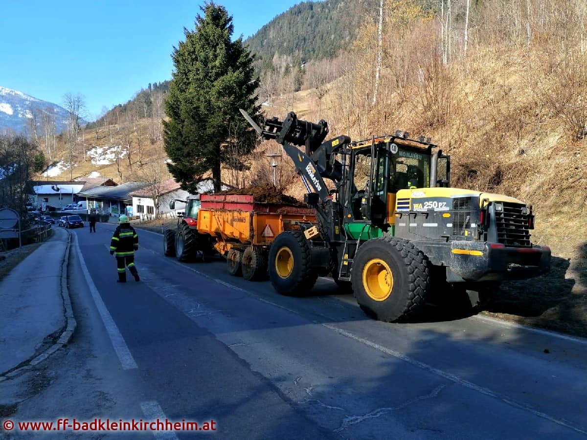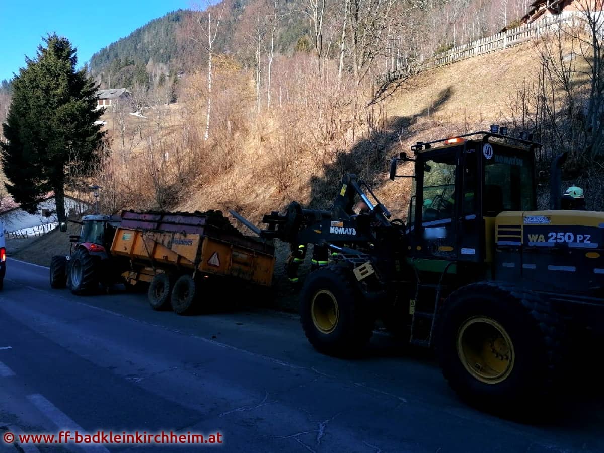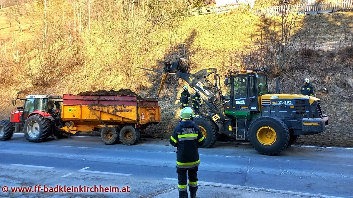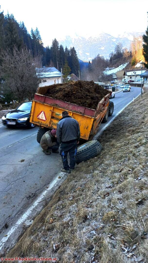 Am Sonntag, den 13.03.2022 gegen 09:00 Uhr wurde die Feuerwehr Bad Kleinkirchheim mittels Sirenenalarm zu einem eher ungewöhnlichen technischen Einsatz auf die B88 alarmiert. Nachdem bei einem mit Mist beladenen Traktoranhänger ein Radlager gebrochen war, wurde die Feuerwehr zur Unterstützung angefordert.