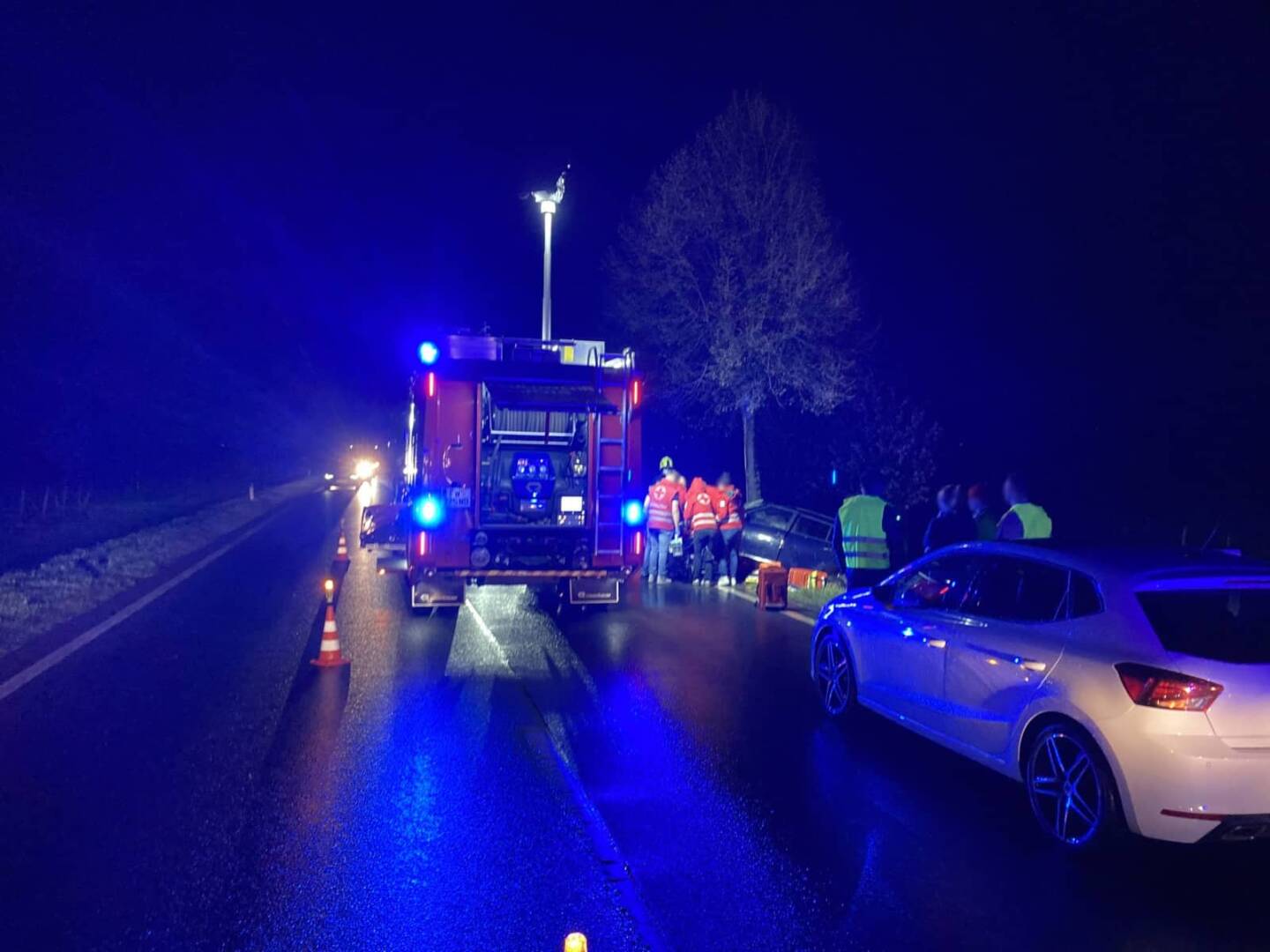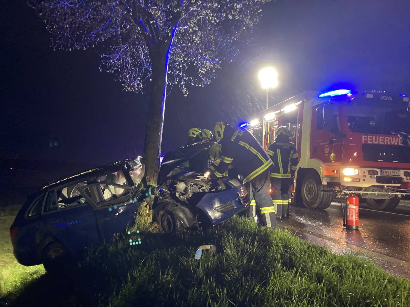 Dort angekommen bot sich folgendes Bild: Ein PKW ist aus unbekannter Ursache von der Fahrbahn abgekommen und in weiterer Folge mit einem Baum seitlich, im Bereich des Beifahrers, mit einem Baum kollidiert. Ersthelfer und First-Responder haben bereits mit der Versorgung des Patienten begonnen. Nach Eintreffen des Roten Kreuzes wurde der Fahrer, welcher alleine im Fahrzeug unterwegs war, aus dem Fahrzeug gerettet. Die weitere Versorgung des Patienten führte das Rote Kreuz zusammen mit dem ebenfalls alarmierten Notarzt durch. Der unbestimmten Grades verletzte Fahrer wurde anschließend in ein Krankenhaus gebracht.