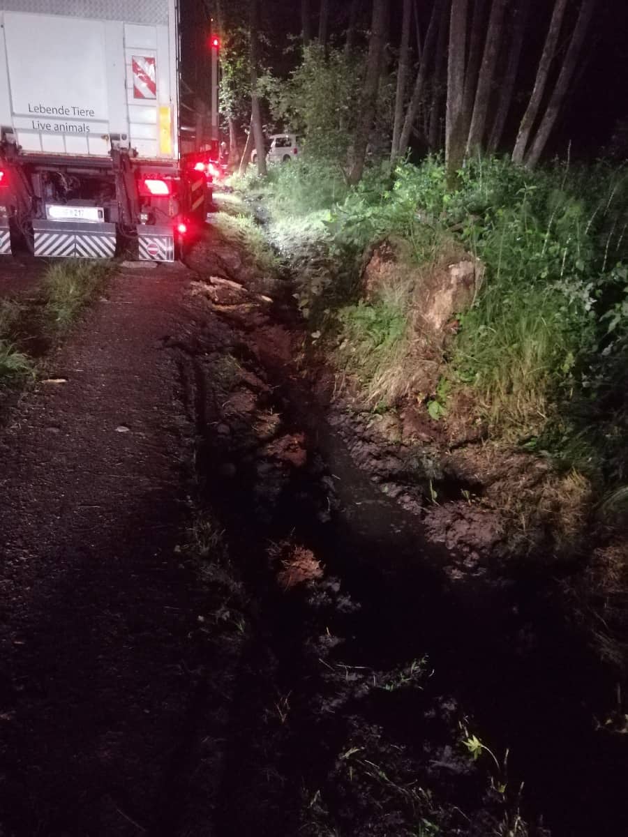 Ein mit ca. 6200 lebenden Hühnern beladender LKW-Zug geriet am Donnerstag, den 02.06.2022, wegen eines Navigationsgeräts auf einen schmalen Waldweg in Neuhaus am Klausenbach. Auf etwas mehr als der halben Strecke geriet der Hänger in einer Rechtskurve in den Straßengraben, dabei neigte sich der Hänger zur Seite und blieb an einem Wurzelstock hängen.